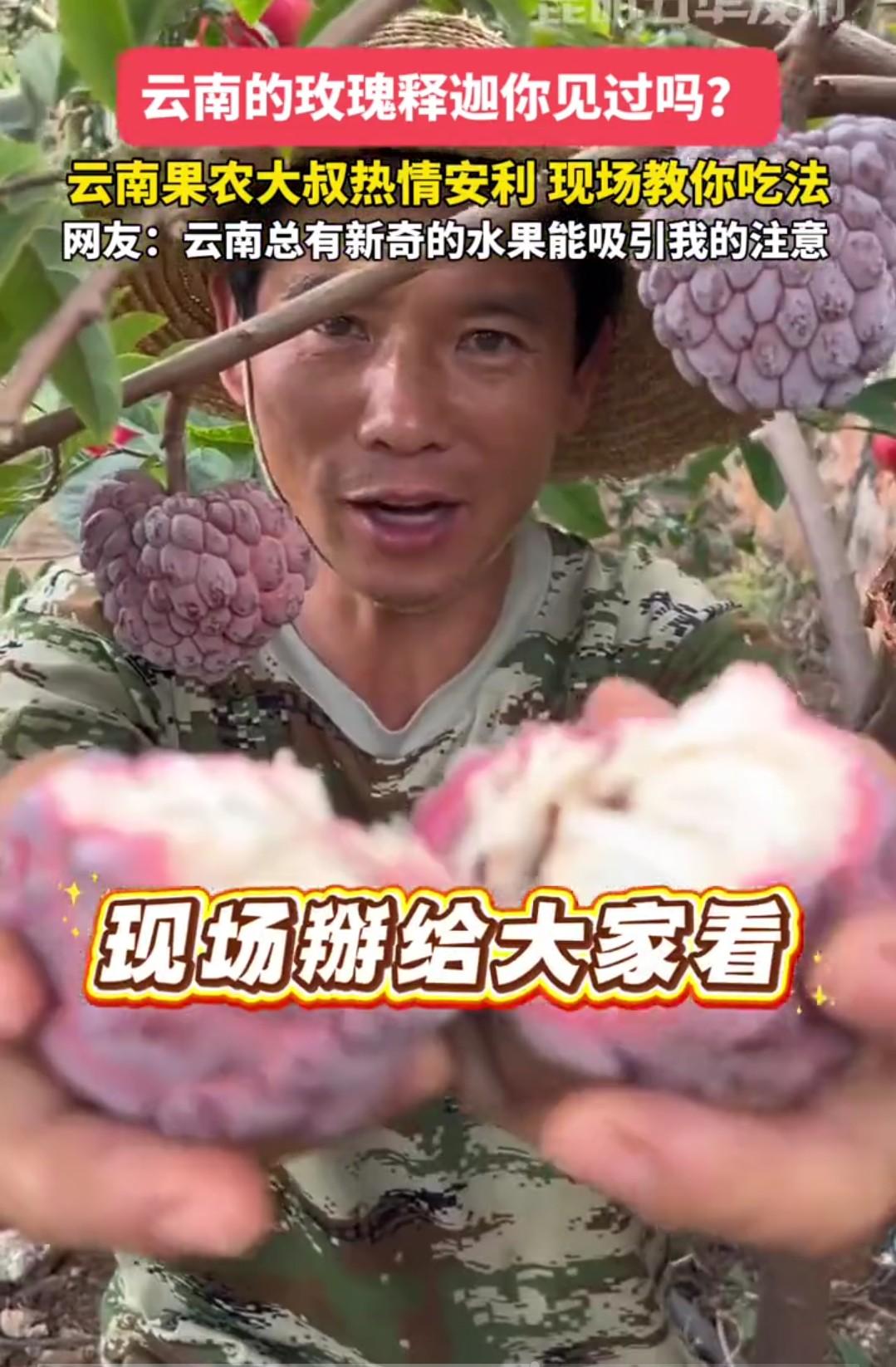 云南的玫瑰释迦果成熟了,你吃过吗? 一位云南大叔家里的玫瑰释迦果成熟了,热情的给人安利玫瑰释迦果,现场教人怎么吃。 看起来很吸引人,我没吃过释迦果,不知道好不好吃,但是看起来好诱人啊。