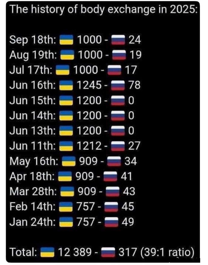 为什么说俄军已经输了?10月,俄乌遗体交换比例达到了38比1。 最近一次阵亡士兵遗体交接中,俄罗斯交还了1000具遗体,而乌克兰只交出了31具。换算成比例,就是38比1,已经非常悬殊。 但是,还有更悬殊的! 6月,这个比例一度达到最高的77.7:1,成为单次悬殊案例。 7月17日的一次交换中,是52.6:1。 2025年以来,俄乌进行过14次遗体交换,俄方共交回12389具,乌方共交回317,全年累计交换比例平均约为39:1。 这就很恐怖了,虽然遗体交换比例不等于真实战损比,但这个数字至少说明,俄军作为进攻方控制更多地区,能收集更多乌军遗体;乌军撤退时往往无法带走战友遗体,导致大量滞留俄控区。 俄军作为进攻方,已经长期控制多个敌战区,已经是事实了。