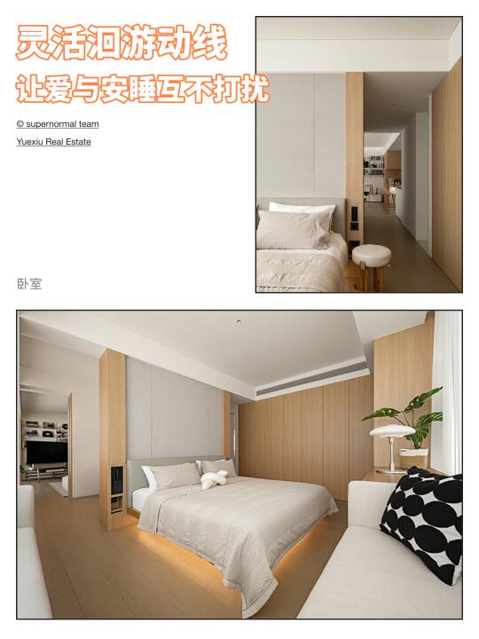 卧室双洄游动线带来贴心的生活体验,早起的一方可以轻声完成洗漱、换衣等动作,不打扰还在休息的另一方,动与静互不干扰。
