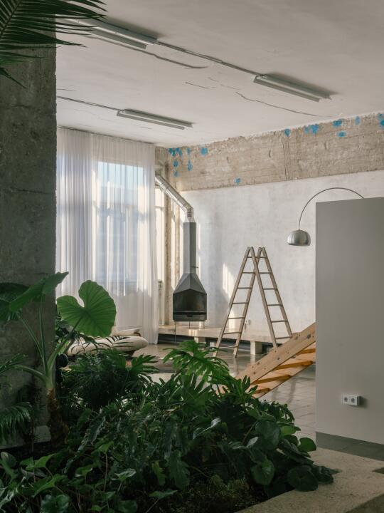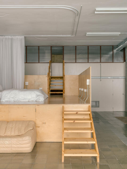 空间被自然分为工作区与生活区,两个功能区相互渗透又保持独立,其中的生活区设有一个高架平台式卧室,被帘幕包裹,兼具结构轻量感与视觉漂浮感,营造出一个柔和、亲密的居住氛围。
