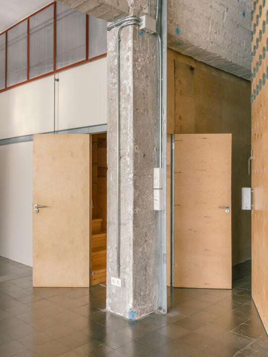 面对每平仅约 350 欧的极限预算,设计团队选择回避大规模拆改,转而采用模块化策略:以预制钢结构、聚碳酸酯板与胶合板构建出多个“嵌入式功能体块”。