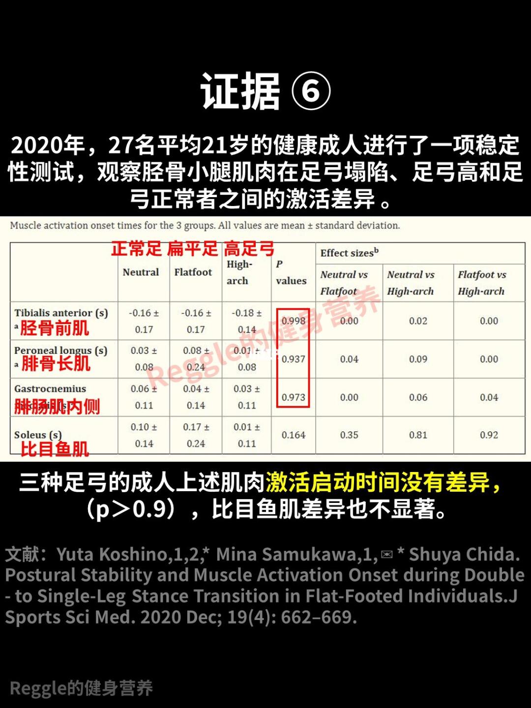 (3)在单腿稳定性测试中,足弓塌陷、足弓高和足弓正常者之间,小腿肌肉(比目鱼肌、腓肠肌内侧、腓骨长肌、胫骨前肌、)的激活启动时间没有差异 。