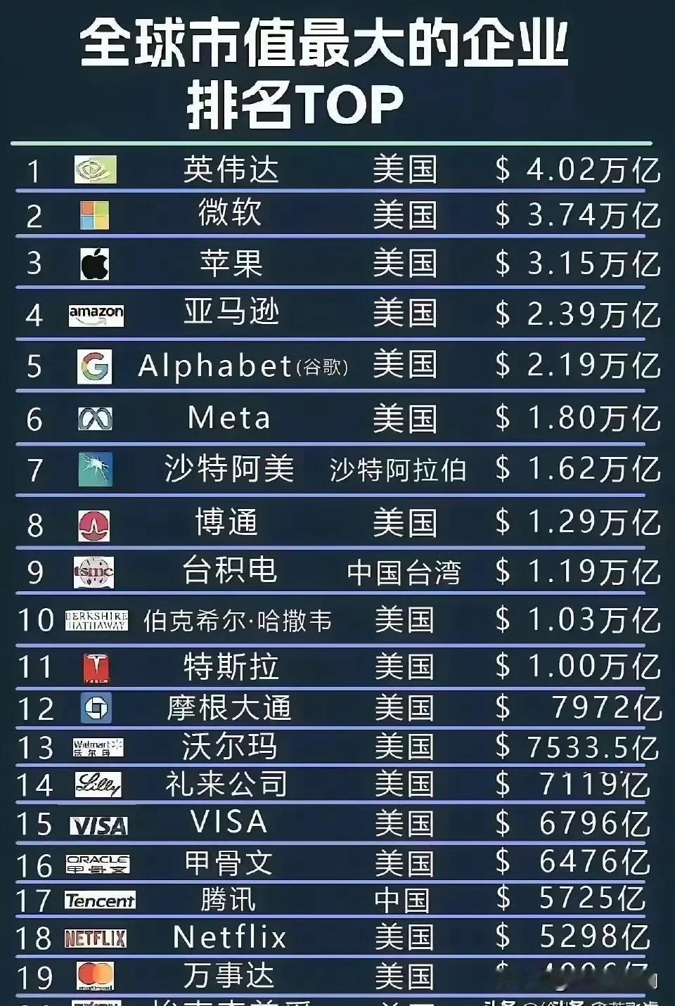 在全球市值最大的前20家公司中,美国占到了17家,中国占2家。