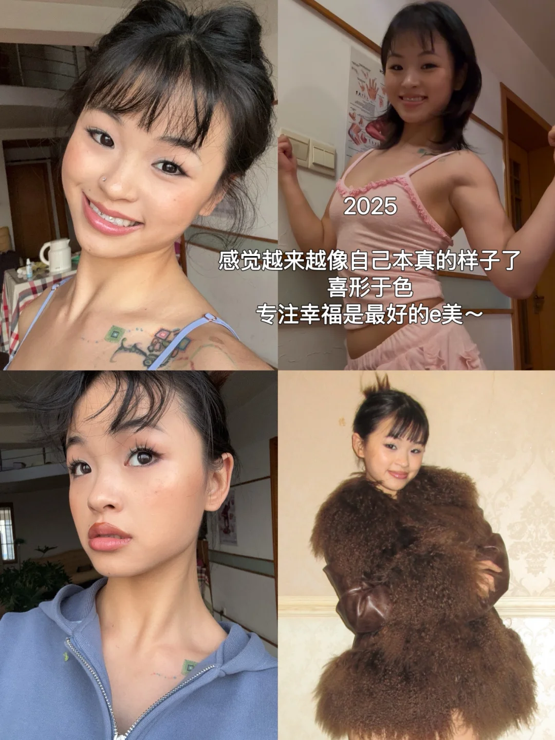 我以前是深度讨好型人格,而且内心充满恐惧,很怕自己的不一样会让自己被伤害,削尖了头钻进所谓的“主流”,所以那时候我讨厌自己会晒黑的皮肤,我不够立体的五官,我短小又有点臃肿的四肢,后面又开始矫枉过正,再到慢慢接受自己原生长相,学着爱自己,为自己感到骄傲,尝试不为别人的认可或者否定而心神动摇。