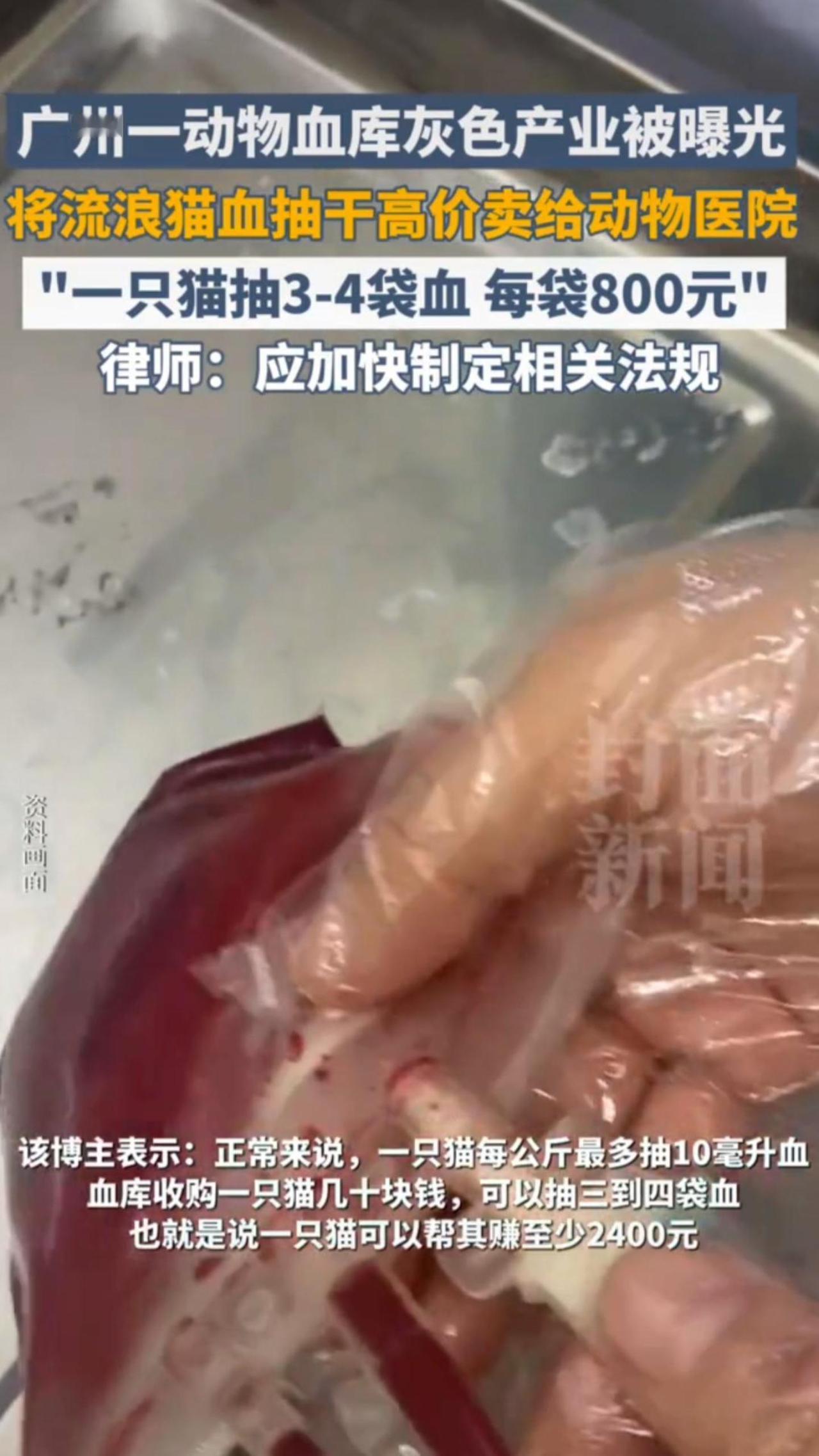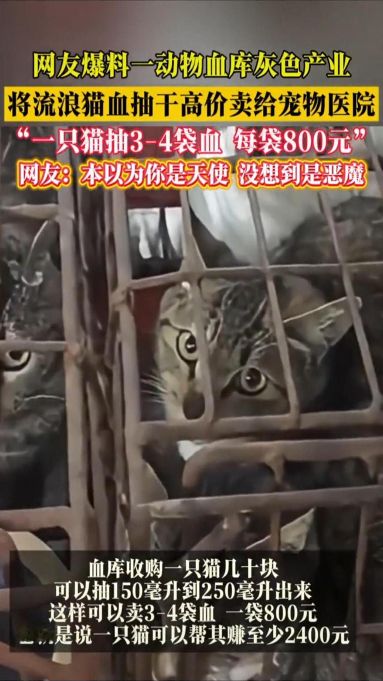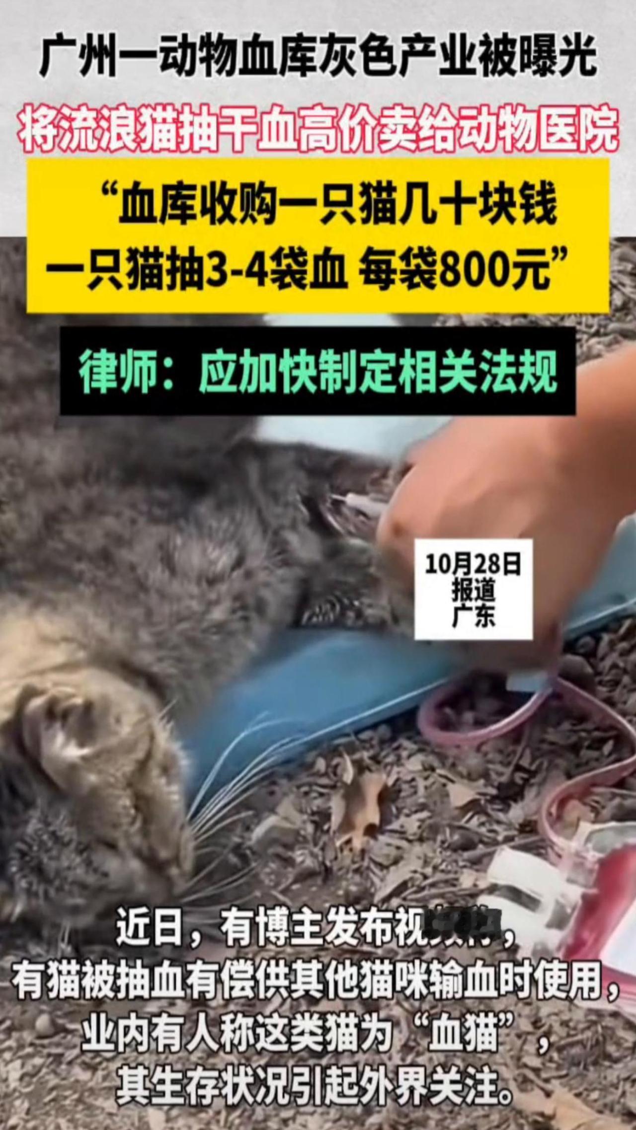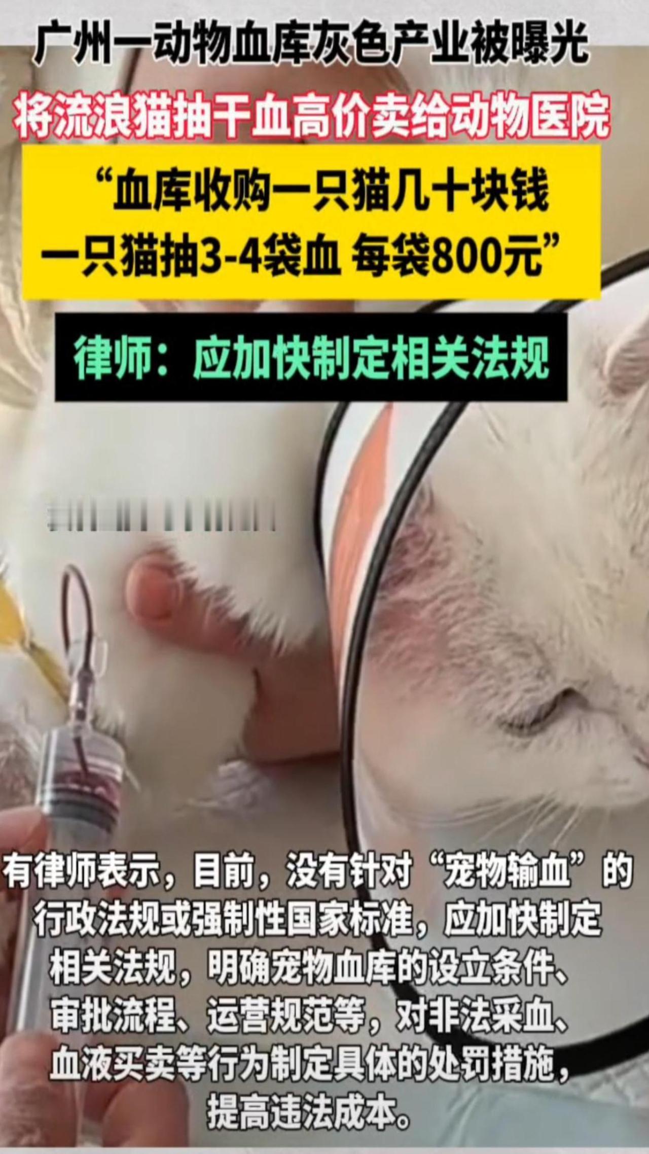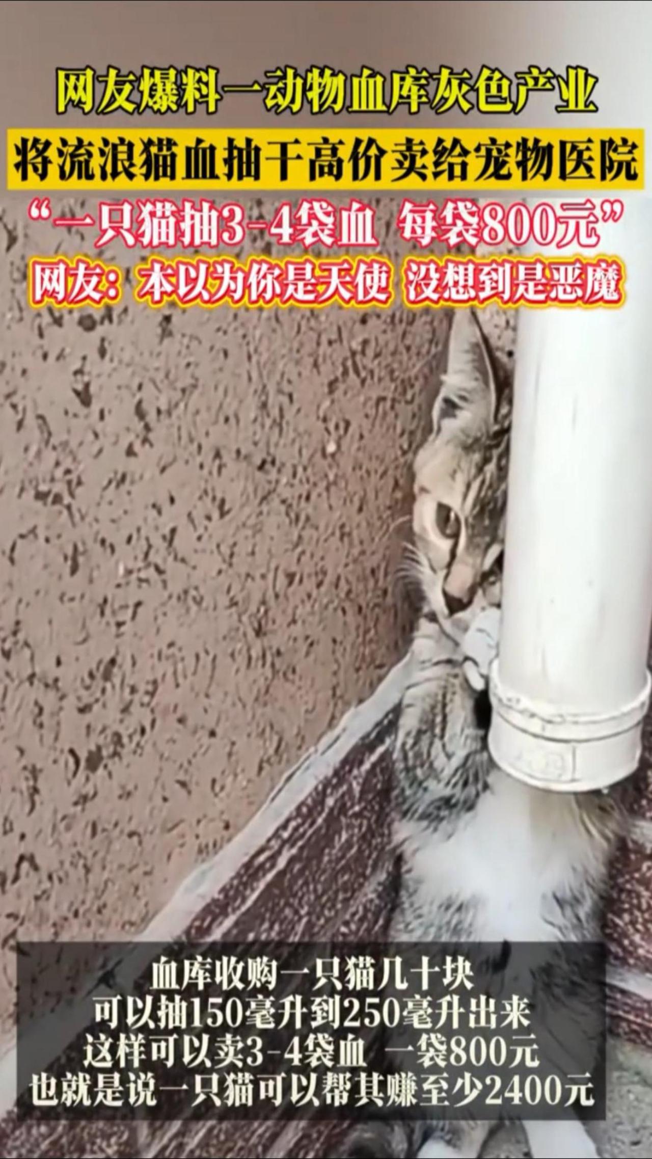 看完这个新闻真是气得手抖。广州那边曝光了一个黑心的“猫咪血库”,简直不把猫当命看。他们把流浪猫当成“移动血袋”,一只猫吊起来硬抽血,抽不出来就甩、就挤,活活把血榨干。一袋血能卖800块,一只猫被抽死的话,能赚到2400——这哪儿是救猫,根本就是杀生。 有个陈女士的猫得了急性肾衰竭,急需输血,宠物医院给推荐了一家说是“正规血库”。结果输完血才三个小时,她的猫就细菌感染死了。她去查,才发现背后黑得吓人:那个血库的仓库里全是生锈的铁笼,关着的猫瘦得站都站不稳,身上还插着抽血的针头。兽医说一只猫最多只能抽每公斤10毫升血,他们硬是抽150到250毫升,这相当于一个成年人被抽掉2000毫升血,谁能受得了? 这些猫大部分是30块钱收来的流浪猫,抽完血就像垃圾一样被扔出去,能活下来的不到10%。更恶心的是,这些血根本不做无菌检测,黑心商家伪造假的“安全报告”,再卖给合作的宠物医院。医院每卖一袋能拿200块回扣,所以他们明知血有问题,还拼命推荐给主人。 最惨的是,还有人专门养“血猫”,关在笼子里定期抽血,连流浪猫都不如。网友说得扎心:“底层猫被榨干,去供养天龙猫。”我们想救自家猫的心情,反倒成了这些人虐待动物的借口。 现在那个血库的老板跑了,动物保护组织在追,可问题是现在我们国家根本没有动物采血相关的法规,这种黑产很难彻底铲除,以后可能还会换地方重来。 要是你也在意这些不会说话的小生命,能做的不多,但有用:一是转发让更多人知道“血猫”的黑幕;二是以后去宠物医院先问清楚他们血的来源正不正规;三是大家一起呼吁尽快出台动物医疗的监管法规。它们不会喊痛,但每道伤都在替它们求救。