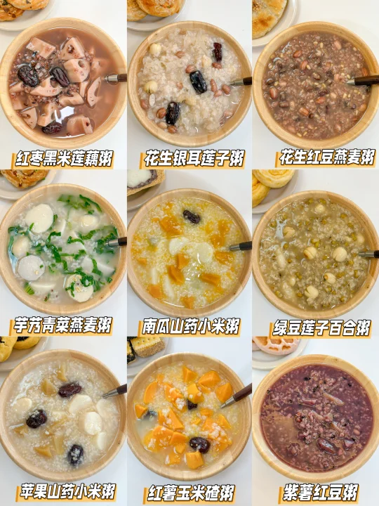 最近天气越来越冷,每天早上都要来碗热乎乎的粥暖暖胃,开启美好的一天[派对R] 今天给姐妹们整理了9款不重样的五谷杂粮粥,每一款都好好喝!无需早起,只需电饭煲提前一晚预约就可以搞定[斜眼R],姐妹们快码住,就等着被全家夸夸吧[飞吻R] - ✨红枣黑米莲藕粥 ✨花生银耳莲子粥 ✨花生红豆燕麦粥 ✨芋艿青菜燕麦粥 ✨南瓜山药小米粥 ✨绿豆莲子百合粥 ✨苹果山药小米粥 ✨紫薯红豆粥 ✨红薯玉米碴粥 具体所需食材请看图文哦~ -