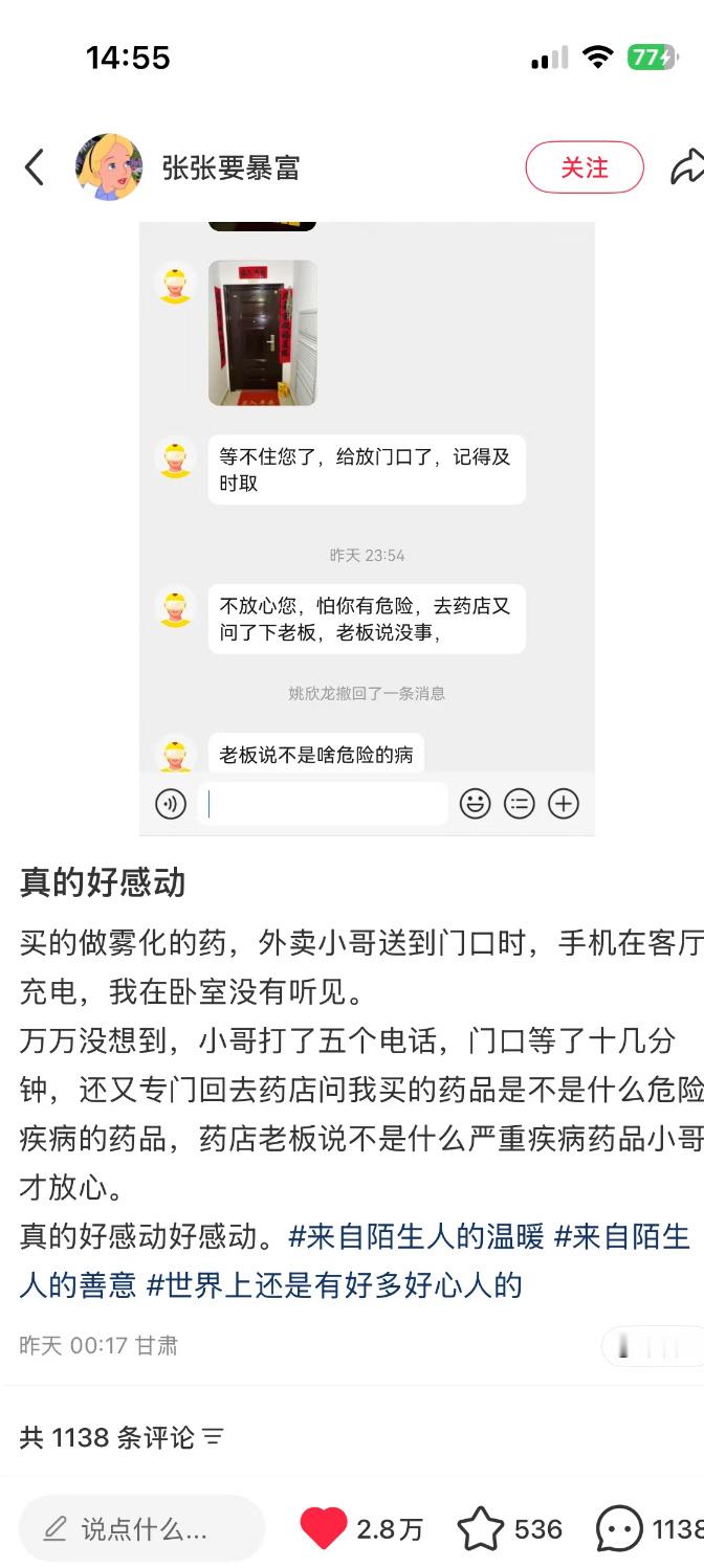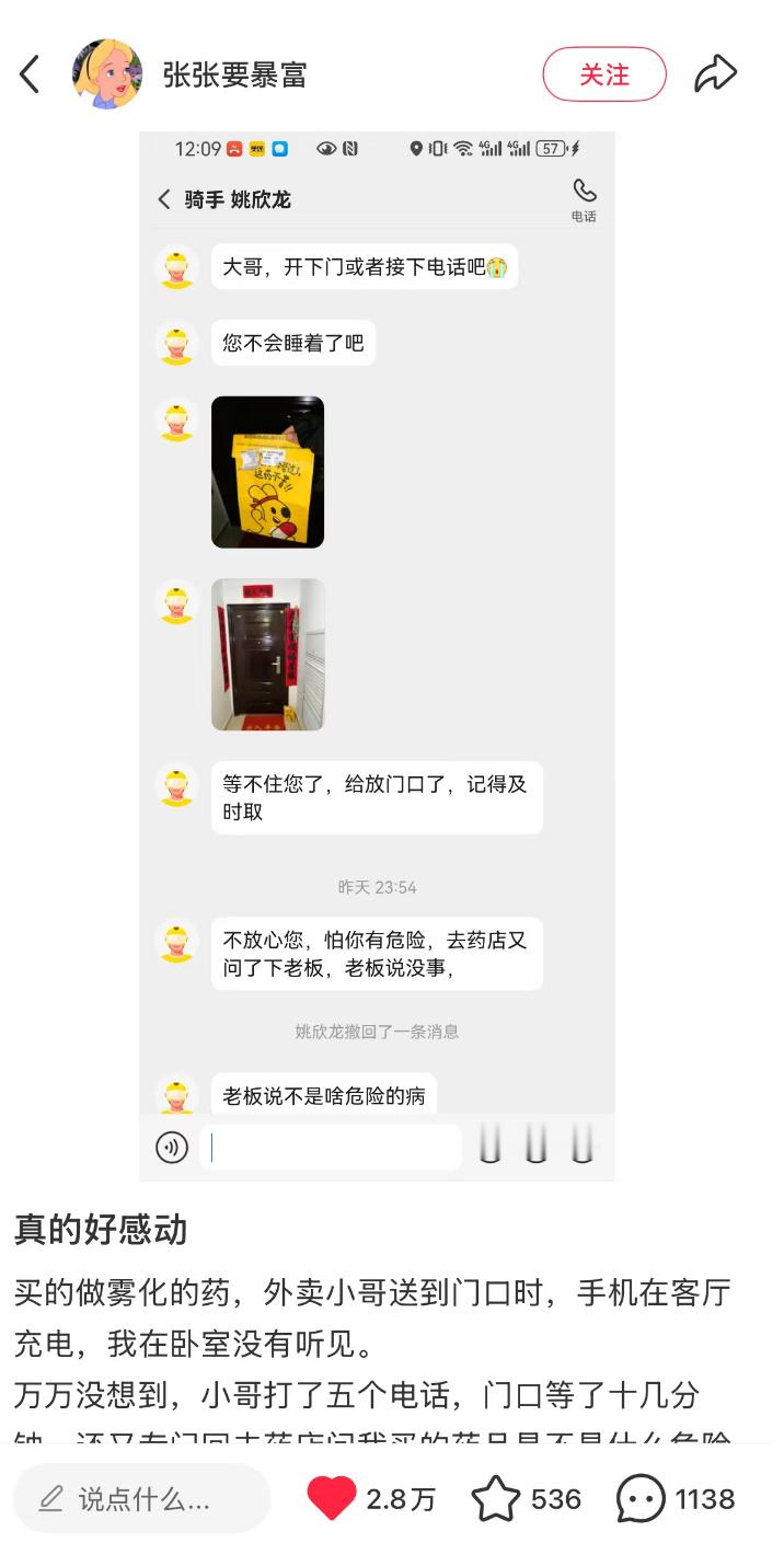 还以为骑手很着急是为了送下一单,没想到是因为送的药联系不到客人怕是治急病的药,真的好善良!