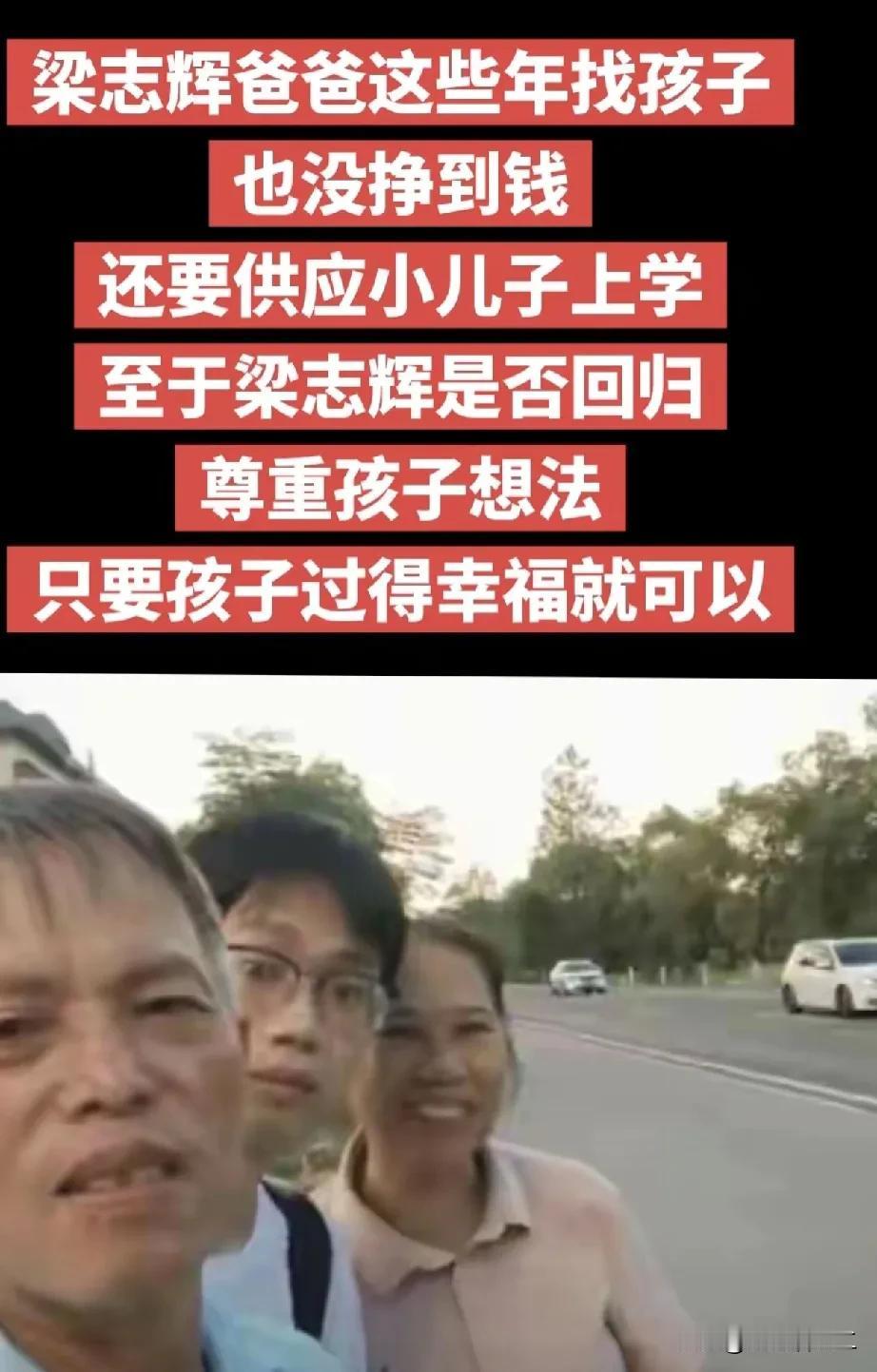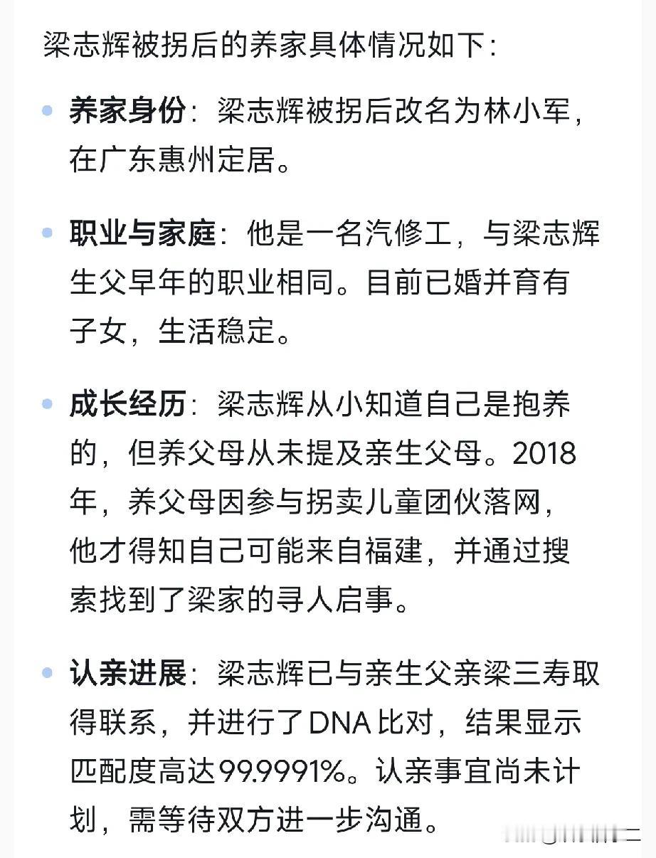 梁志辉养家情况曝光!梁志辉是在广东惠州找到的,他是一名汽车修理工,目前已婚,并育有儿女,现在的名字叫林小军。 据网友透露,梁志辉养家经济条件很好,家里有两栋楼,而只有他一个孩子。 巧合的是,梁志辉爸爸以前也从事过汽车修理工的工作。 可能出于隐私的考虑,梁志辉家人并没有公开梁志辉的真实样子。 梁志辉的妈妈账号换成了以前模拟长大时的样子,估计和现在十分相像,不得不佩服科技的力量。 梁志辉现在没有到亲生父母的身边,梁志辉爸爸说,给孩子一点时间适应,尊重他的想法。 虽然梁志辉找到了,但估计很难割舍和养家的感情,毕竟一起生活了30多年,但梁志辉家人能知道他的生活情况就很知足了。