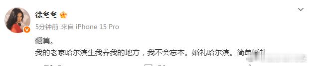 徐冬冬尹子维哈尔滨办婚礼徐冬冬尹子维婚礼在哈尔滨 刚刚,徐冬冬发文:翻篇。我的老家哈尔滨生我养我的地方,我不会忘本。婚礼哈尔滨。简单婚礼。