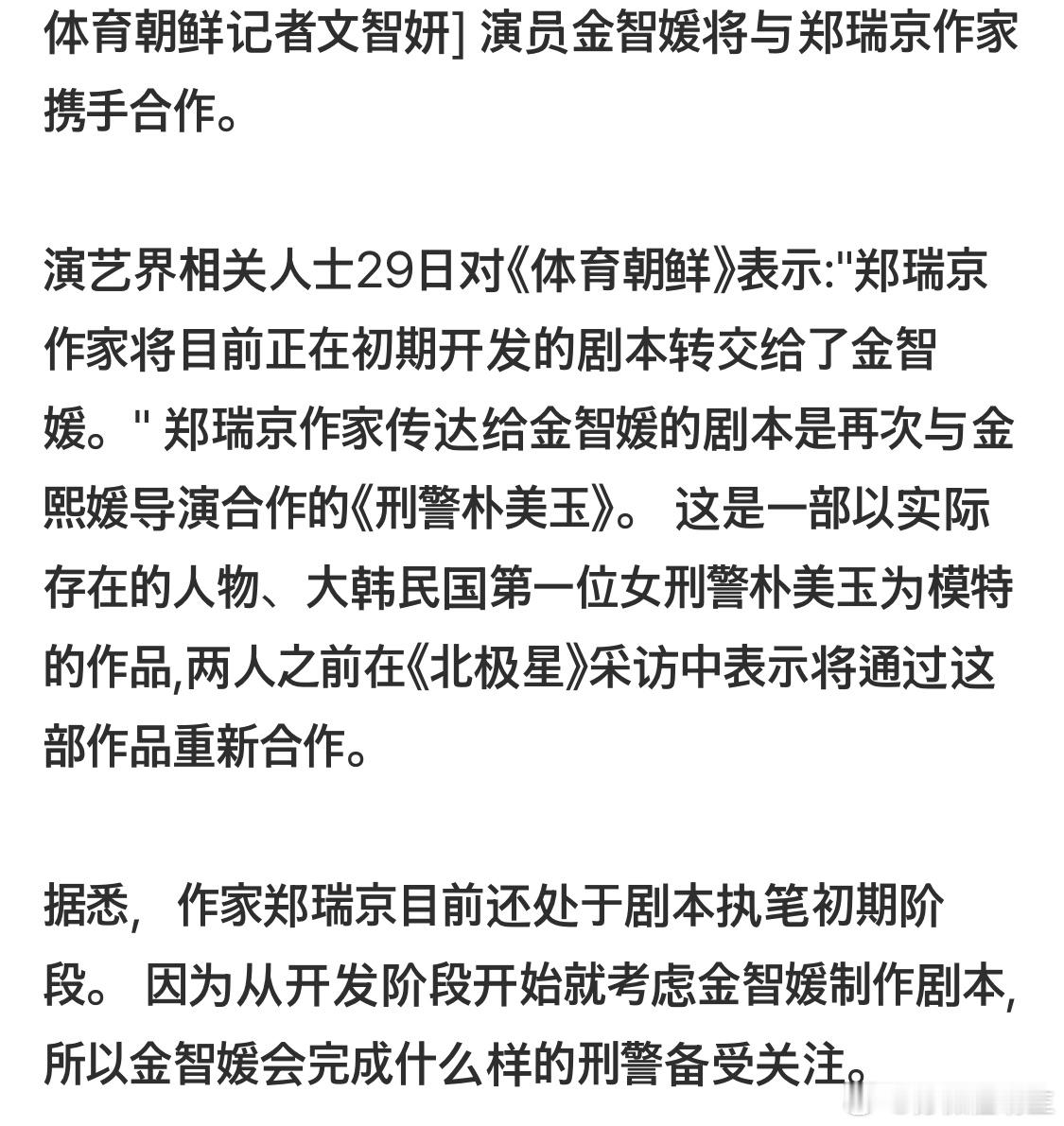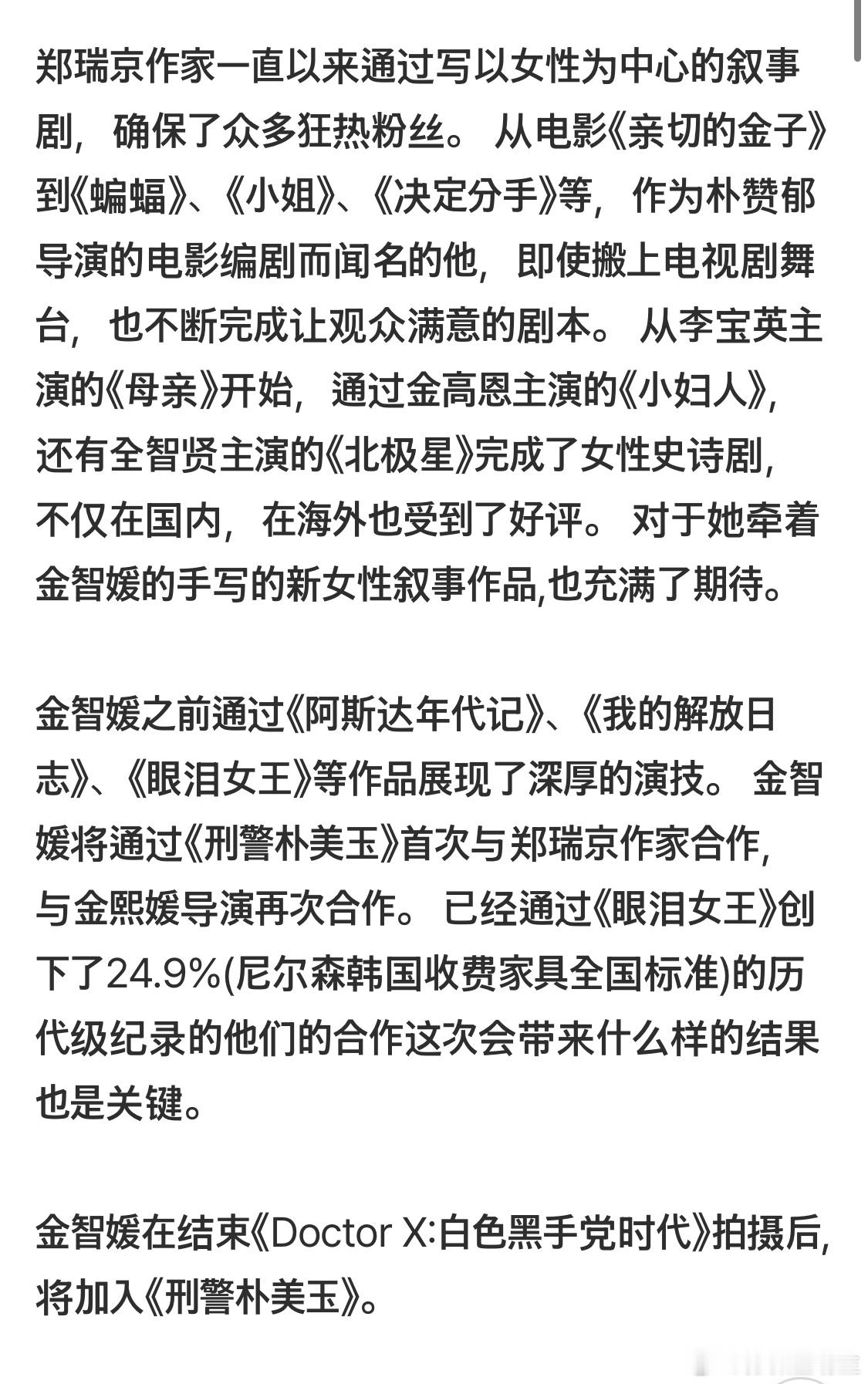 郑瑞京编剧金希元导演,新女主角金智媛...刑警朴美玉主人公