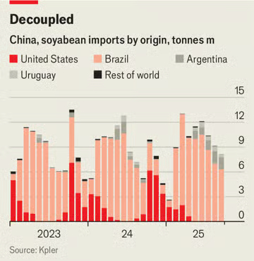 最引人注目的是放弃美国大豆,去年占中国进口的四分之一,4 月以来被征20%关税。中国尚未购买美国大豆,相反,从巴西购买创纪录,也从阿根廷大买。大豆期货表明,中国不太可能在本季恢复从美国大量进口。