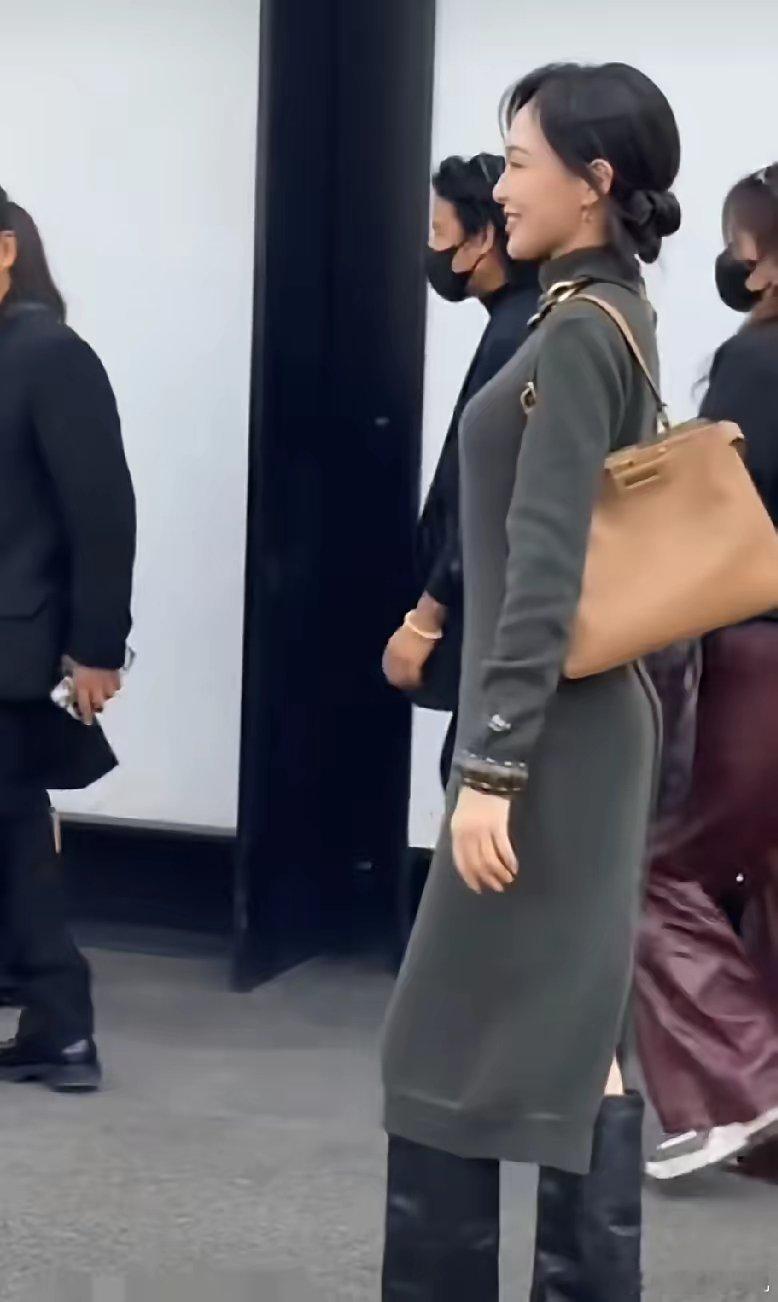 灰色紧身长裙,配姜黄色挎包,随便一搭,居然搭出时尚天花板!