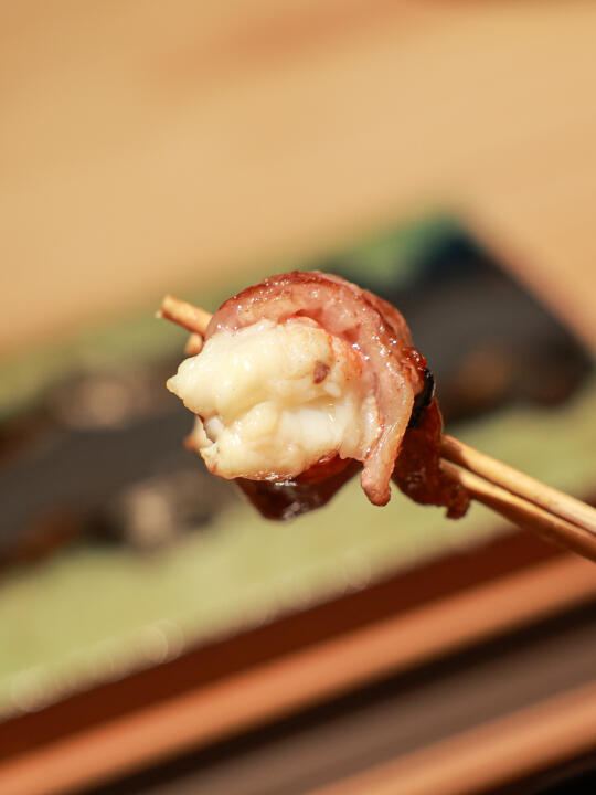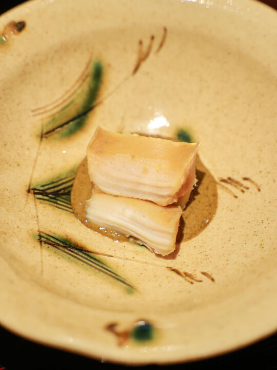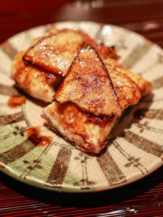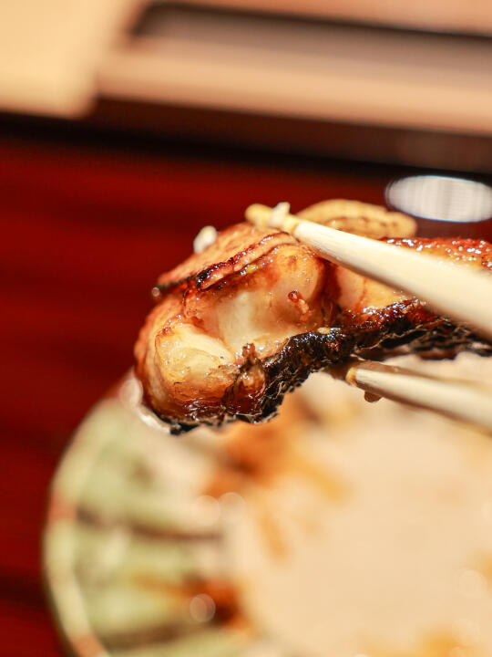 鹅肝虽然吃起来如奶油般浓郁,但盖在烤物上,也容易腻,薄切则尽可能地减少了鹅肝过于厚重的问题;底下的鳗鱼油润鲜嫩,低温慢煮后保留了海洋风味;底下还有烤制的鳗鱼皮,黏滑之余,更多的是焦脆感。