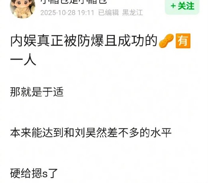 内娱真正被防爆而且成功的生是不是只有于适?本来可以达到刘昊然的高度,硬是被摁下去了。