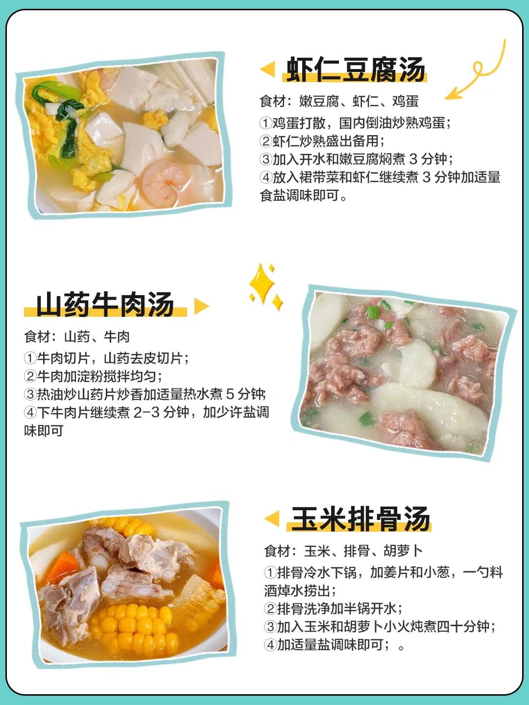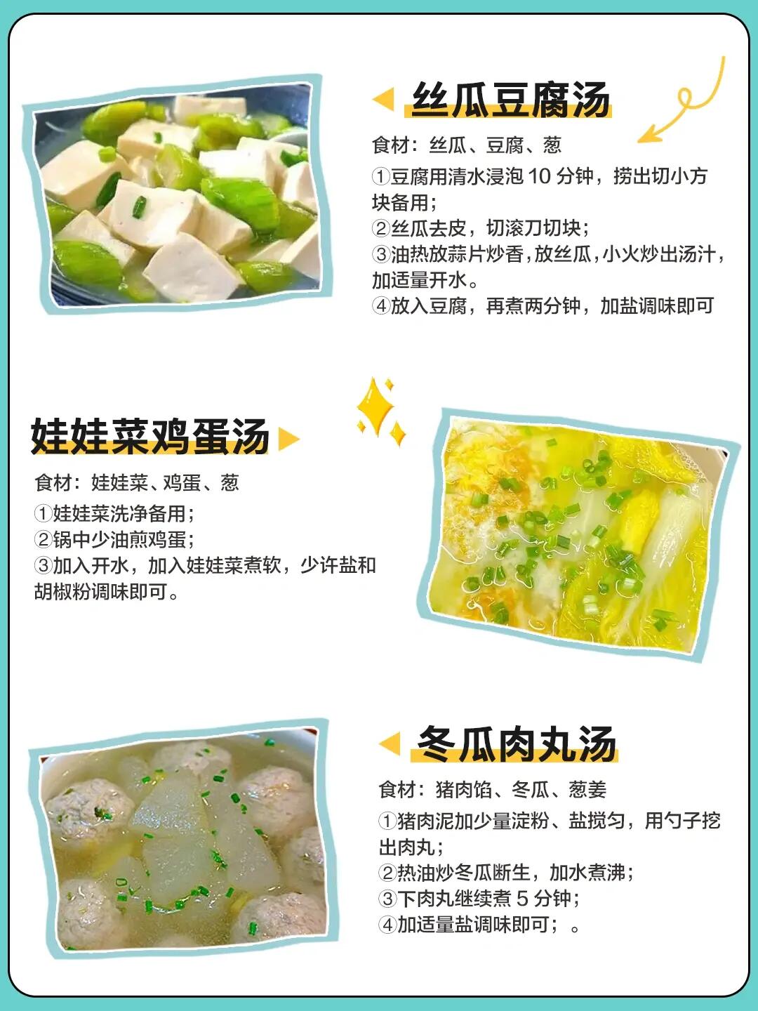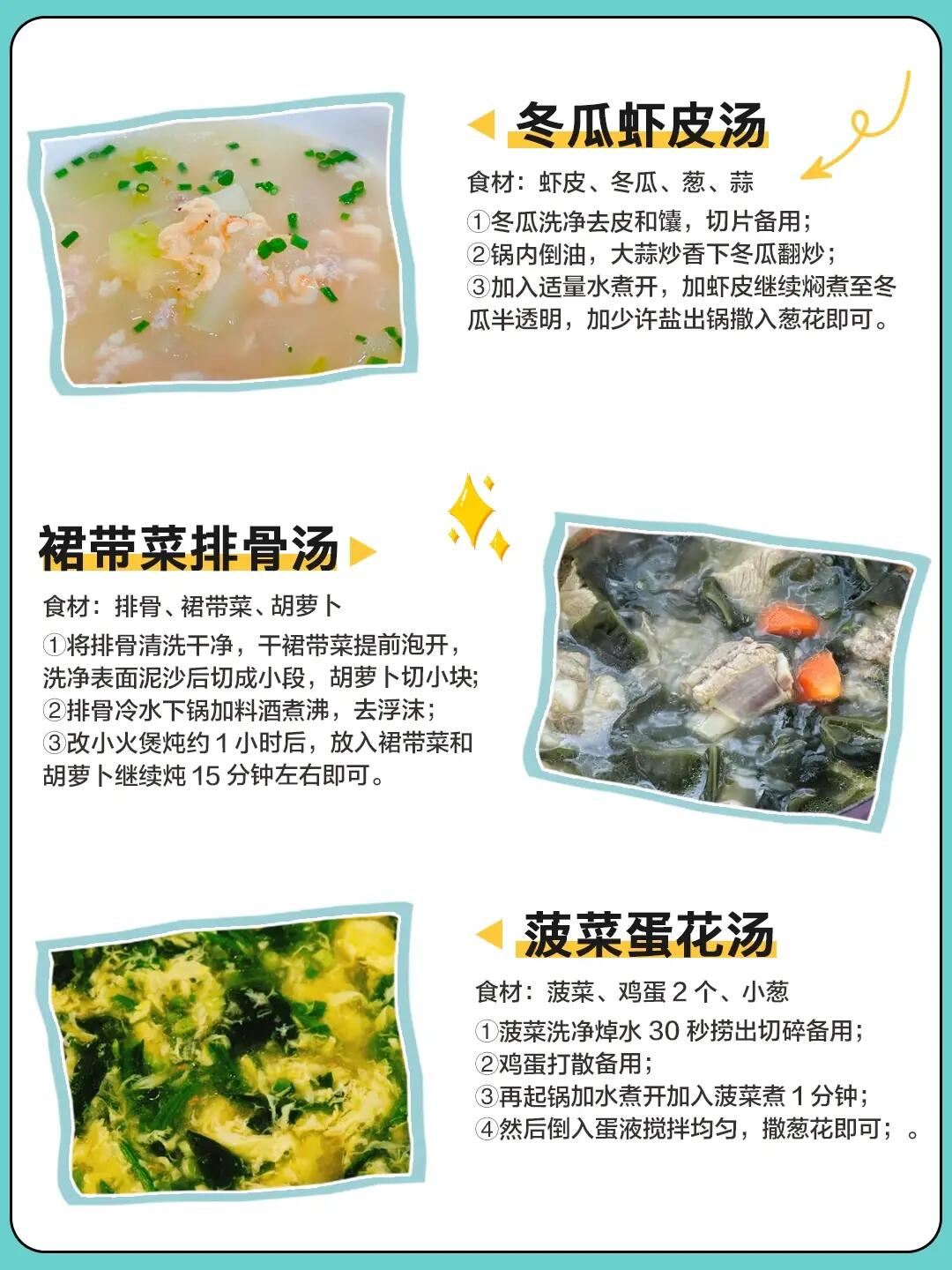 [彩虹R]一到夏天小孩就容易没胃口,分享11款超级好喝又开胃的营养汤给大家!而且都很好做哦,赶紧给宝宝安排上吧~ 💛番茄菌菇汤 💛冬瓜花甲汤 💛冬瓜虾皮汤 💛裙带菜排骨汤 💛菠菜蛋花汤 💛丝瓜豆腐汤 💛娃娃菜鸡蛋汤 💛冬瓜肉丸汤 💛虾仁豆腐汤 💛山药牛肉汤 💛玉米排骨汤 具体做法步骤大家可以看上面的图片~