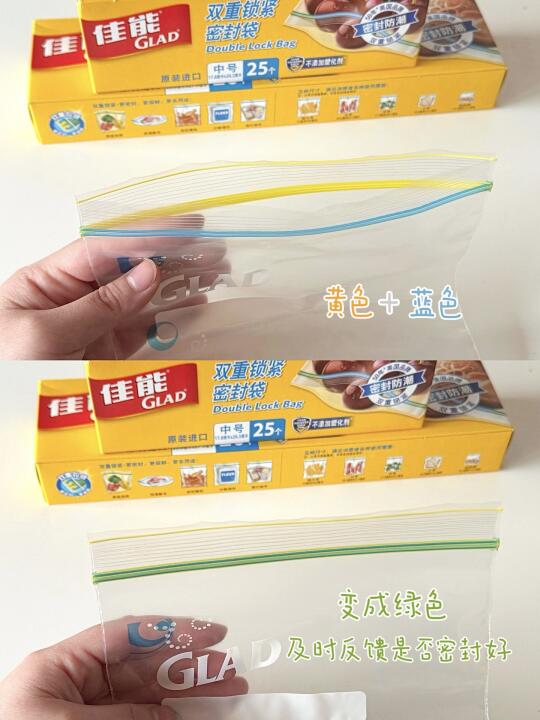 它做到了气密级锁鲜🔒可以防潮不漏,每次囤的水果一次吃不完,及时放入密封袋内,可以有效锁水,延长保鲜的时间👍而且独有的密封拉链设计也很贴心🥰黄色拉链+蓝色拉链=绿色🍃可以及时检查袋子是否密封好✌️很喜欢这个小巧思!