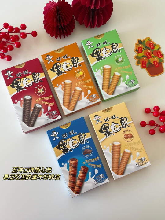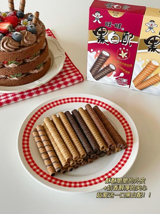 这样一份新年组合甜品完成啦~再搭配上不同口味的旺旺黑白配!幸福感拉满🥰外层酥酥脆脆的~里面还有奶香丝滑的香醇夹心🍫口感hin细腻~新升级后甜度对我来说刚刚好~是记忆里的童年味道!用料也敲讲究!精选进口可可粉和新鲜鸡蛋制作而成😋