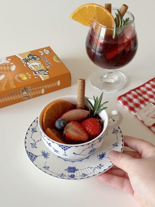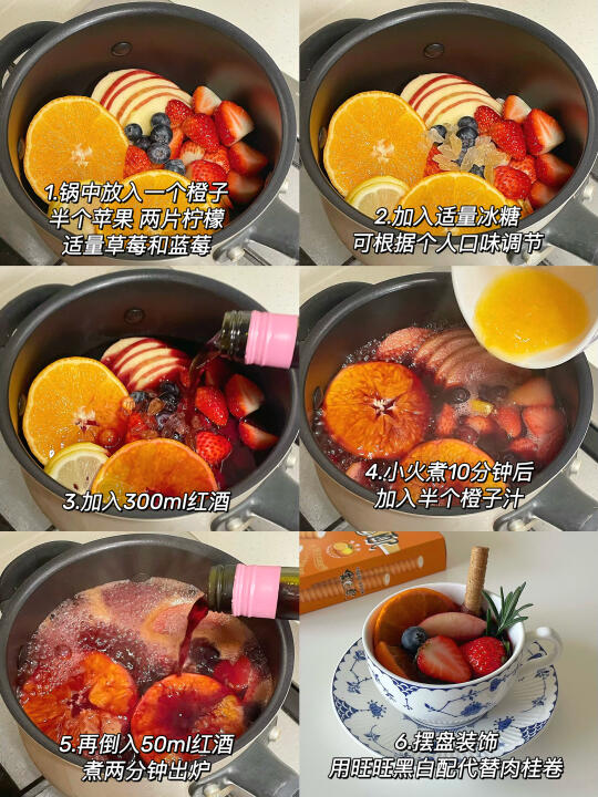 准备橙子苹果柠檬草莓,倒入红酒煮热,再加入半个橙子汁和少许红酒煮片刻,出炉摆盘,用旺旺黑白配代替肉桂卷。
