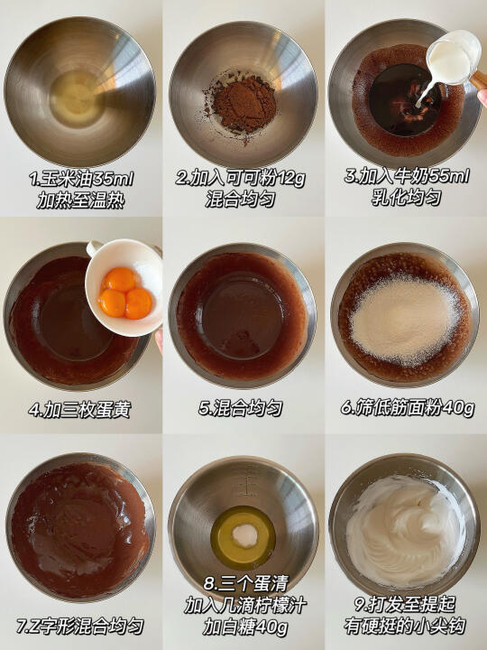 1️⃣玉米油加热至温热,筛入可可粉搅匀,再加牛奶乳化均匀,再加蛋黄混匀,筛入低筋面粉Z字形混匀。