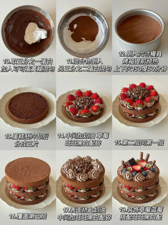 3️⃣出炉后放凉分成三片,挤奶油一圈旁边放草莓,中间夹心放旺旺黑白配。