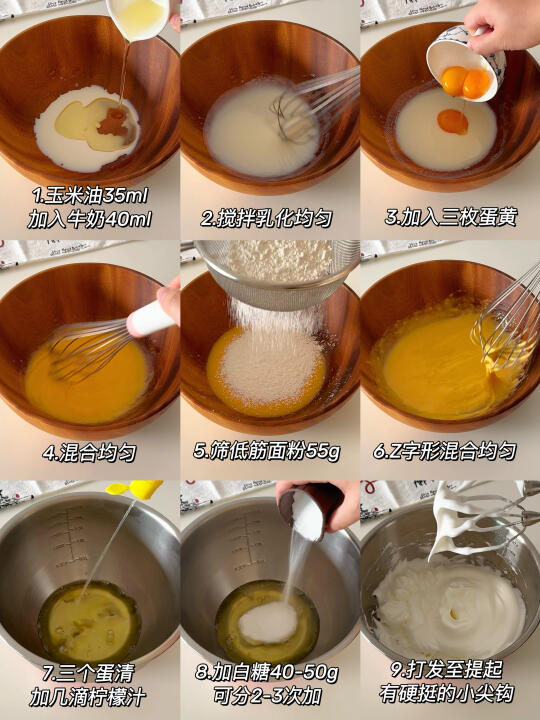 低筋面粉55g、柠檬汁几滴、白糖40-50g