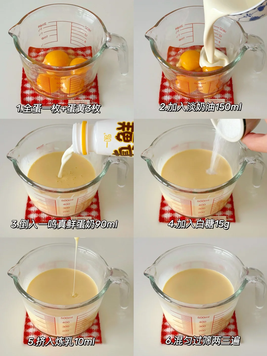 蛋挞皮10个、鸡蛋1枚+蛋黄3枚、淡奶油150ml