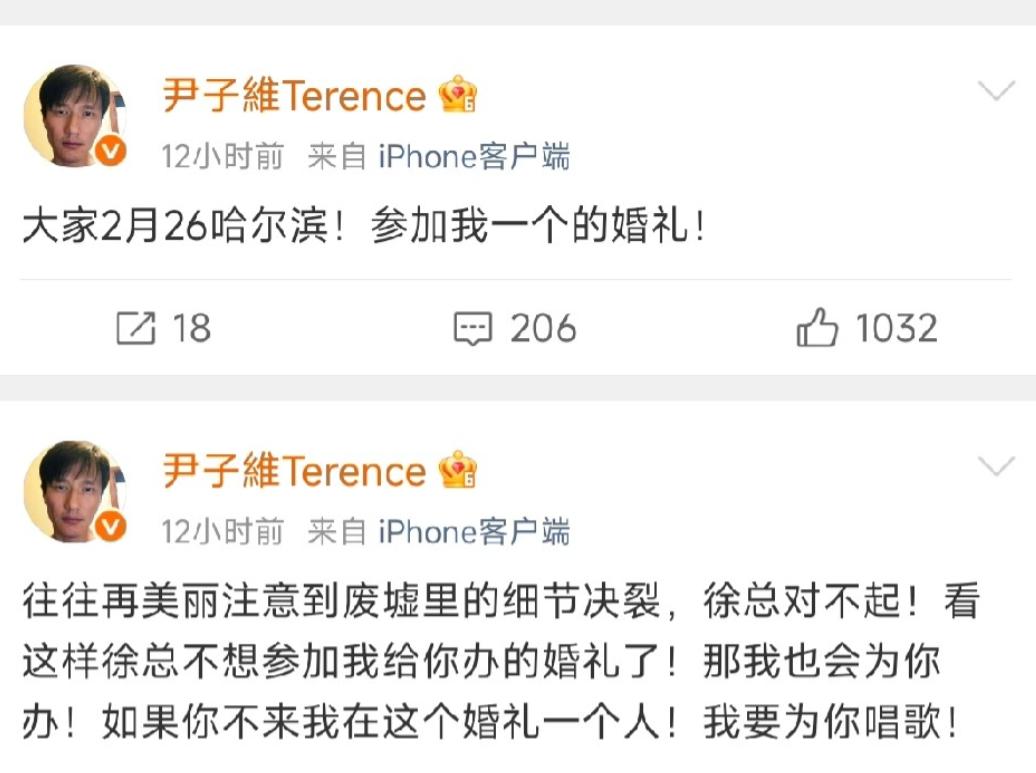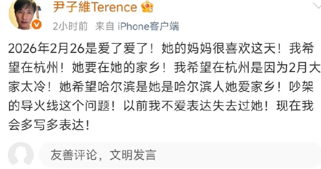 尹子维深夜情绪失控,连发数十条动态,邀请大家在2月26日,参加他一个人的婚礼,同时透露徐冬冬将不会参加,但是自己还是为她办! 这场突如其来的情绪化宣告,让这对相差14岁的情侣再次站在舆论聚光灯下。 从相识相恋至今,九年时光里他们的感情之路从未平顺,分分合合的波折早已被外界熟知,而此前订婚消息传出时,这对被网友称为“椰汁女神”的徐冬冬与尹子维,也曾收获不少祝福。 如今这场单方面掀起的婚礼风波,让公众对徐冬冬的后续回应充满了好奇与期待。 引发这场轩然大波的根源,并非什么不可调和的情感裂痕,而是一场关于婚礼场地的“南北之争”。 徐冬冬始终坚持要回到老家哈尔滨举办婚礼,且希望以流水席的形式完成这场人生大事。 对她而言,婚礼不只是两个人的仪式,更是对家乡的眷恋与回馈,这份植根于成长记忆的情感联结,让哈尔滨成为她心中无可替代的选择。 而尹子维则有着截然不同的现实考量,他更倾向于在两人定居的杭州筹备婚礼: 杭州作为长期生活的城市,婚礼筹备资源更为集中,各项事宜办理起来便捷高效; 更关键的是,2026年2月的哈尔滨正值深冬,严寒天气很可能影响宾客体验,甚至有网友调侃,这般低温环境下,流水席的菜品或许还没上桌就会结冰,实在不符合一场圆满婚礼该有的状态。 尹子维深夜里近乎“疯狂”的表达,第一时间就让网友们陷入懵圈。 不少人第一反应是调侃,猜测他是不是饮酒后一时冲动才说出这些话; 也有长期关注两人感情的网友满心担忧,毕竟他们此前就有过分分合合的经历,这次会不会是再次闹掰的信号。 这场风波的背后,其实藏着两人相处的核心症结。 情绪平复后,尹子维自己也承认,他最大的问题就是不懂得如何好好沟通。 这次之所以用如此极端的方式宣泄情绪,本质上是长期沟通不畅的集中爆发。 他想用密集的动态传递想法,却没想到让事件发酵到全网皆知,甚至让“一个人的婚礼”成为外界热议的话题,险些沦为一场闹剧。 如今,这场“南北之争”仍未迎来明确结果,徐冬冬的回应也迟迟没有到来。 这对走过九年时光的情侣,经历过多次分分合合仍选择相守,这份羁绊本就珍贵。 希望他们能真正坐下来坦诚对话,既尊重徐冬冬对家乡的眷恋,也兼顾尹子维的现实考量,找到双方都能接受的解决方案。 毕竟,一场圆满的婚礼从来不是单方面的坚持,而是两个人的互相包容与妥协。 期待这场因沟通不畅引发的风波,最终能转化为一次修复关系的契机,让九年相守不负时光,让这场备受关注的婚礼,最终以圆满的姿态落幕。 今天的分享到这里就结束了,大家对此事有何看法,欢迎在评论区留言和讨论,感兴趣的可以点击头像加关注,我将每日更新优质内容,我们下期见。