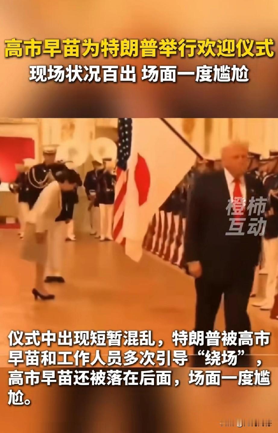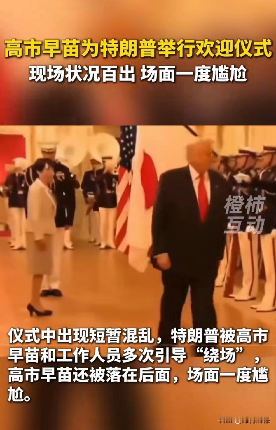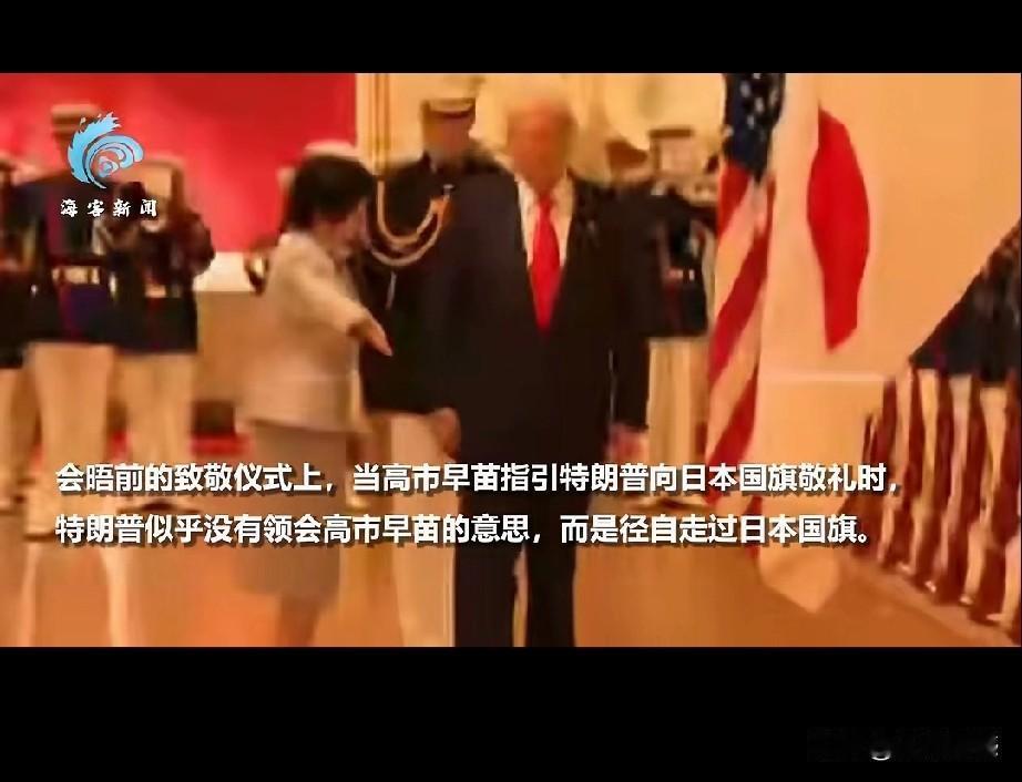特朗普在访日期间展现了自己强硬的个性,在他与高市早苗会晤前的致敬仪式上,高市早苗指引特朗普向日本国旗敬礼时,特朗普似乎没有领会对方的意图,或是故意视而不见,揣着明白装糊涂,径自走过了日本国旗,并且把高市早苗远远的抛在了后面,现场一度很是尴尬!