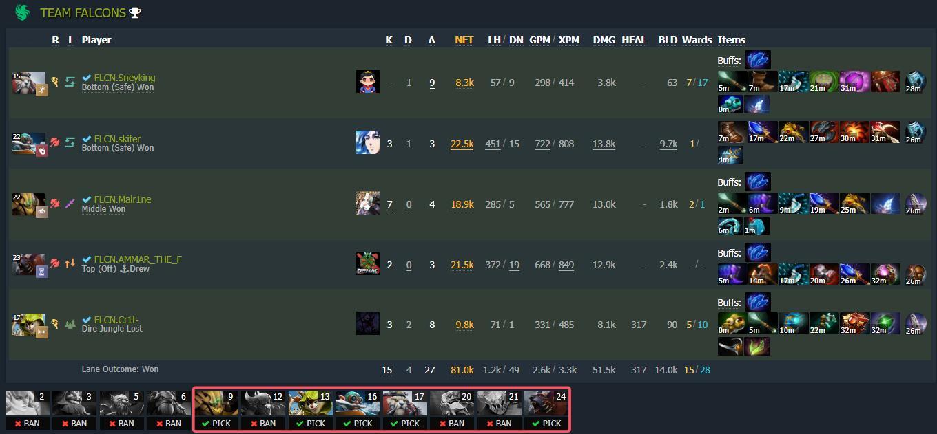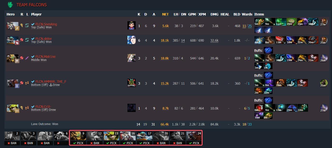 昨晚FLCN输给Mouz的第二局比赛猎鹰选择了跟TI14总决赛第四局一模一样的阵容,不仅英雄一个没变连选择的顺序都完全相同:后选9手抢沙王,13手补沙王最佳搭档松鼠,16、17手连点出海民飞机,最后24手给ATF劣势路拍拍,这局他们一度取得了近8K的经济领先但最终还是遭到了水晶哥龙骑完美发挥的翻盘