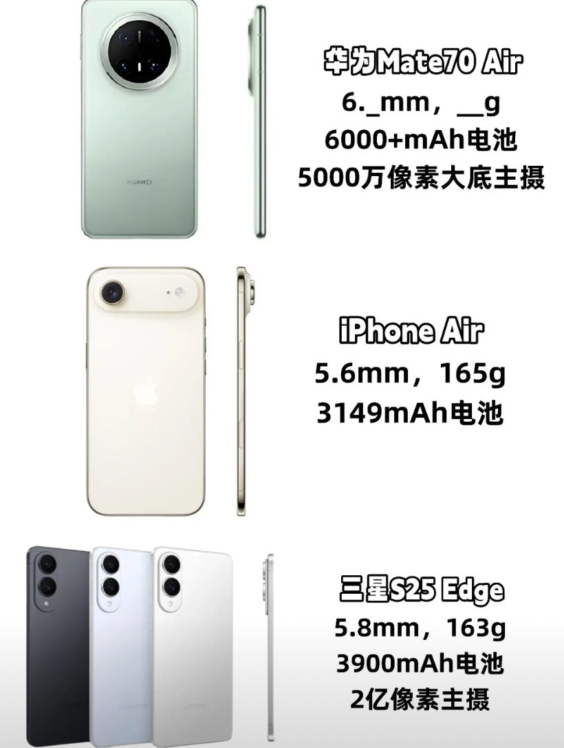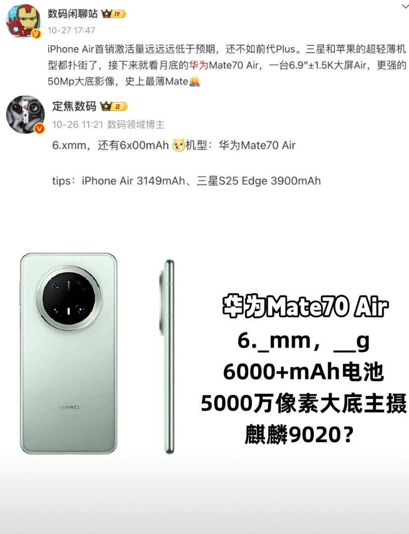 网传下个月华为将会发布华为Mate70 Air,6.9英寸大屏、5000万像素大底主摄、6000+mAh大电池,厚度在6毫米左右,比iPhoneAir、三星S25Edge厚一点点,但电池大不少,是不是这才是Air版本答案?应该和Mate80系列一起登场,有期待的吗?
