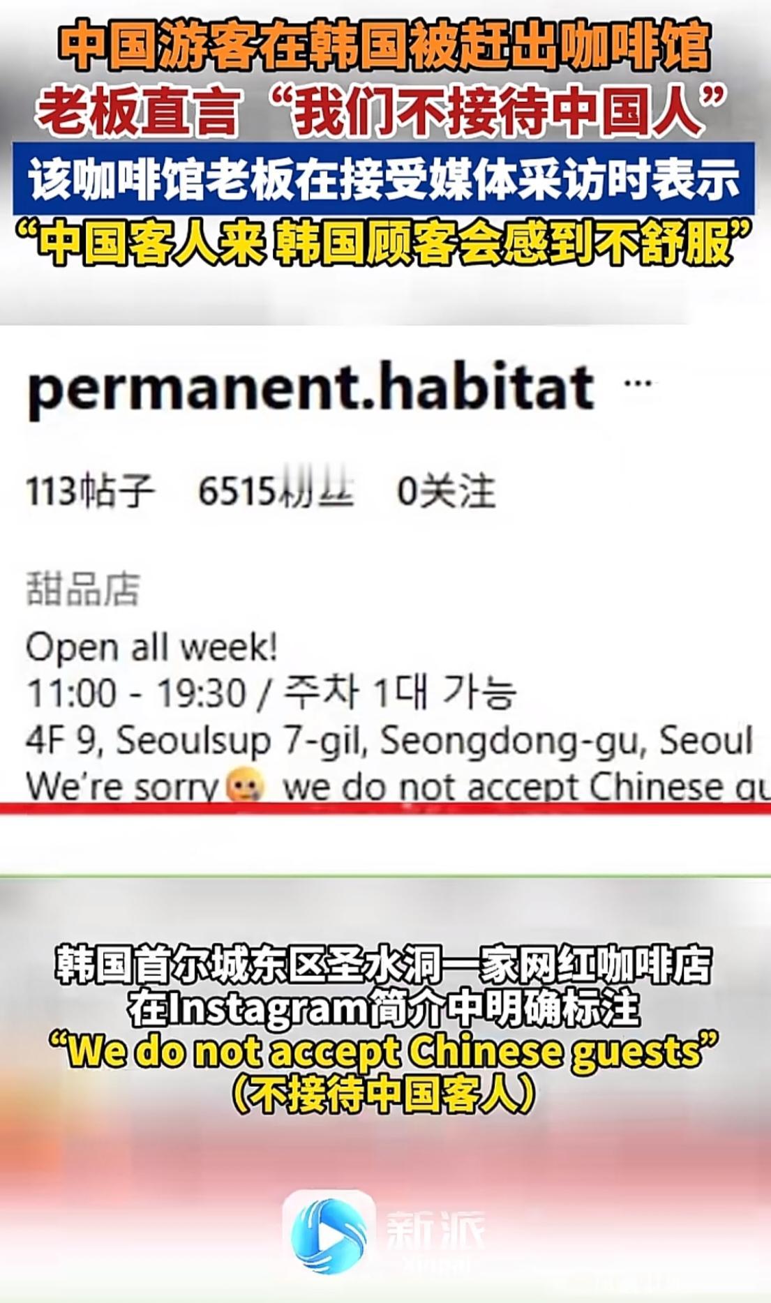 气死人了!中国游客被嫌弃了,韩国一家咖啡店说中国游客会让韩国游客不舒服,说真的咱们国内不喜欢小日子的有,但很少有歧视韩国游客的吧?他们韩国明星还经常跑中国赚钱,这么搞真让人反胃!