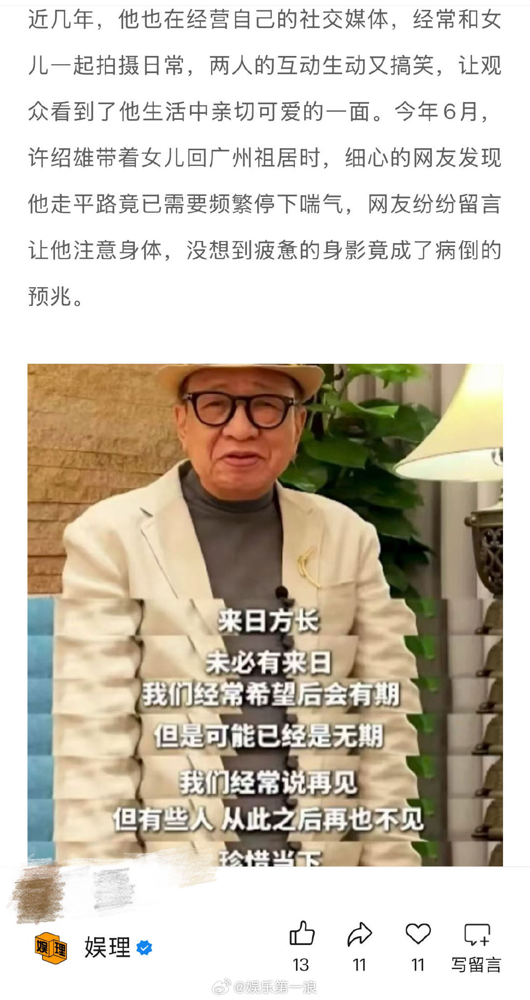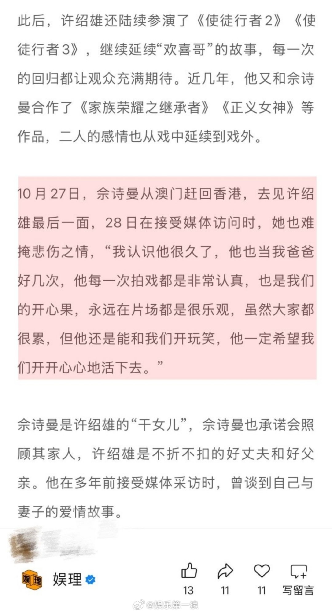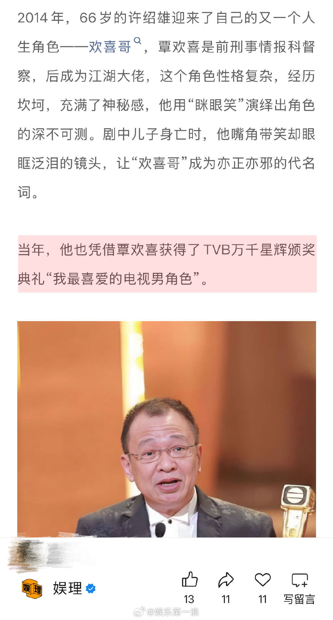 许绍雄 演到生命的最后一刻 许绍雄说最好的告别是活在角色里 2014年,66岁的许绍雄迎来了又一人生角色欢喜哥,他用“眯眼笑”演绎出角色的深不可测,并因此获得了TVB万千星辉颁奖典礼“我最喜爱的电视男角色”。此后,许绍雄还陆续参演了《使徒行者2》《使徒行者3》,继续延续“欢喜哥”的故事,每一次的回归都让观众充满期待,和佘诗曼的感情也从戏中延续到戏外…娱理独家↓