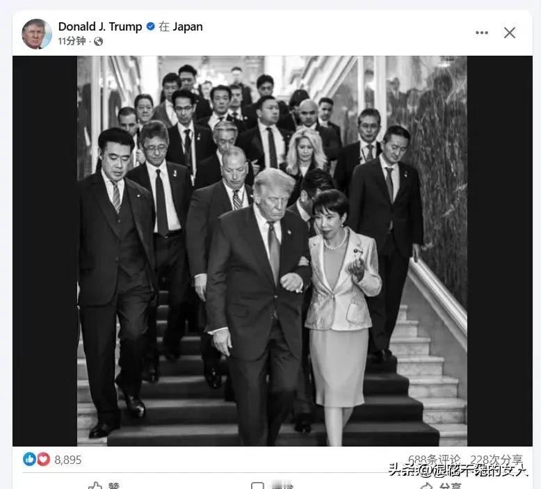 服了! 特朗普访问日本虽然时间不长,但是,🉑没少给美国人民以及他自己争光添彩?[捂脸] 这不,高市早苗挽着他下台阶的照片被他发到了自己的社交平台上,可没少引得他的粉丝的关注和留言。有的网友留言:直呼在一起。
