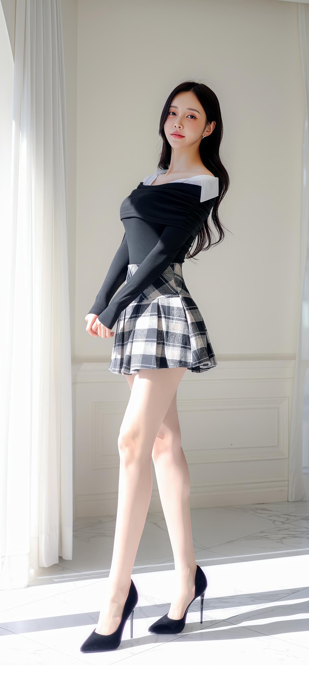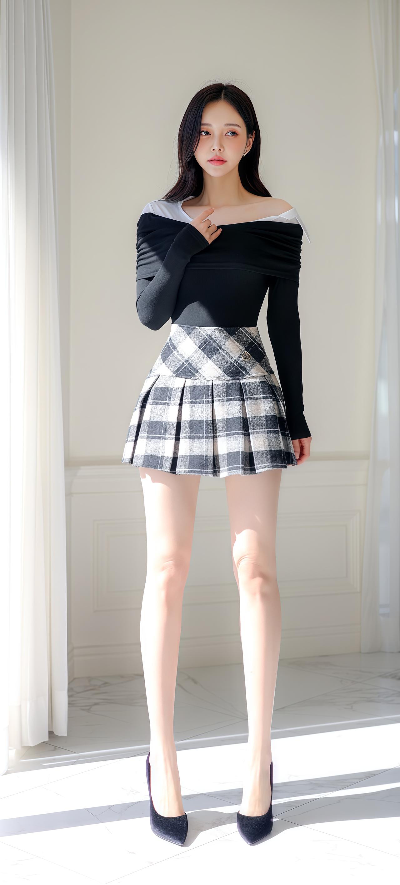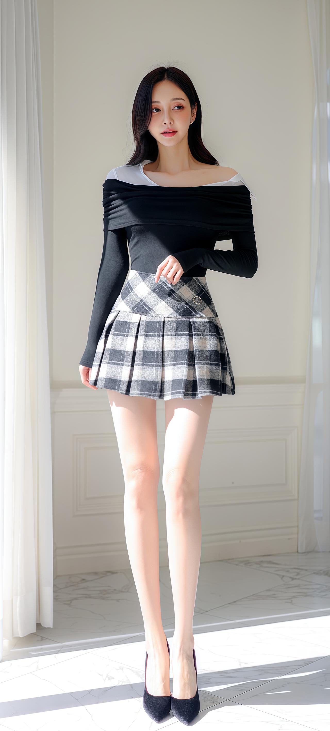 孙允珠优雅黑白格裙,时尚露肩上衣,甜美少女风,轻松出街look!