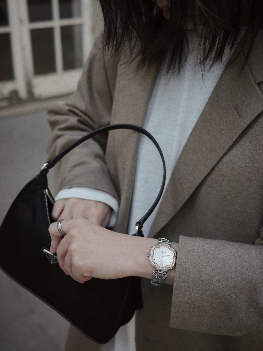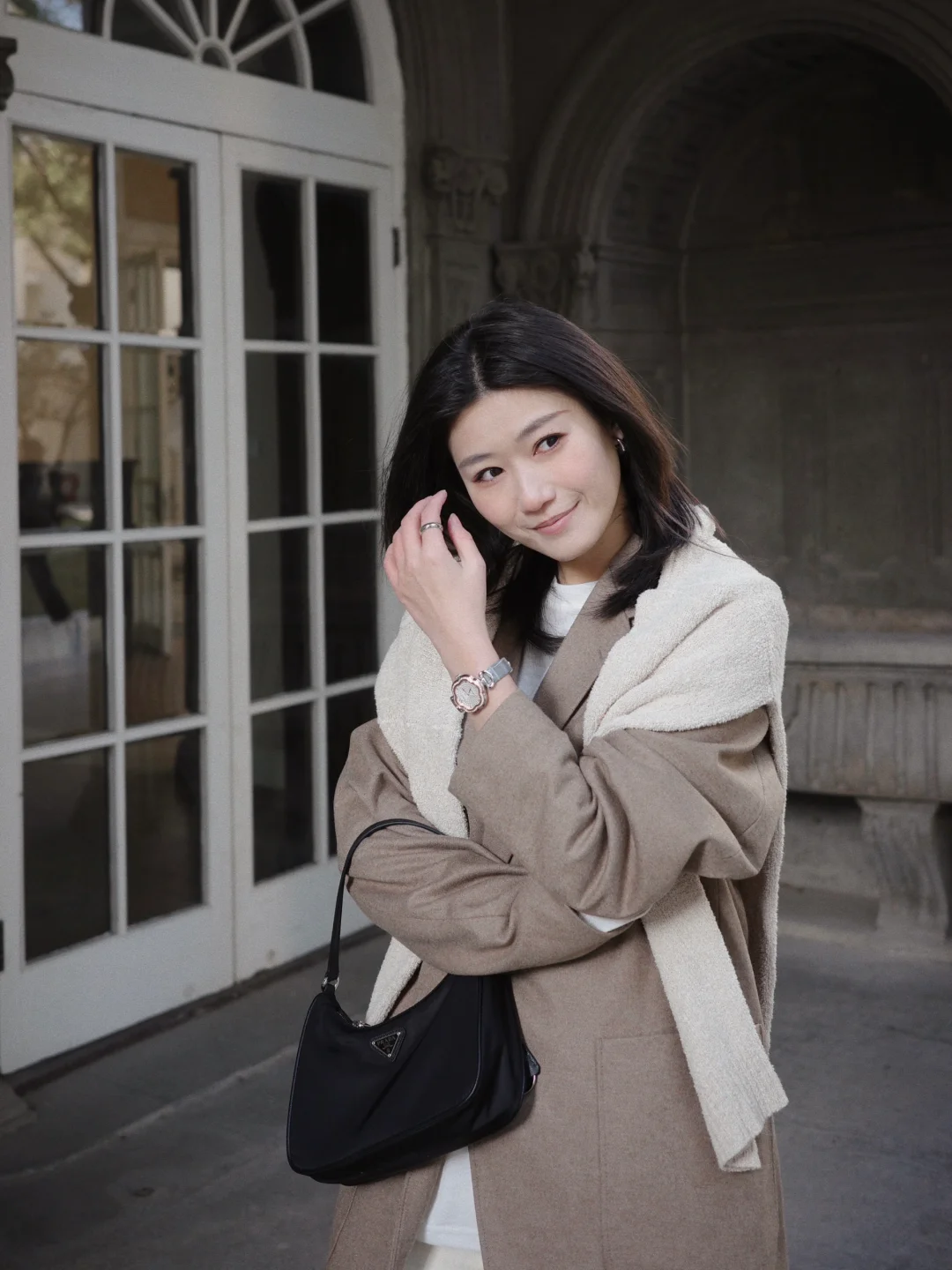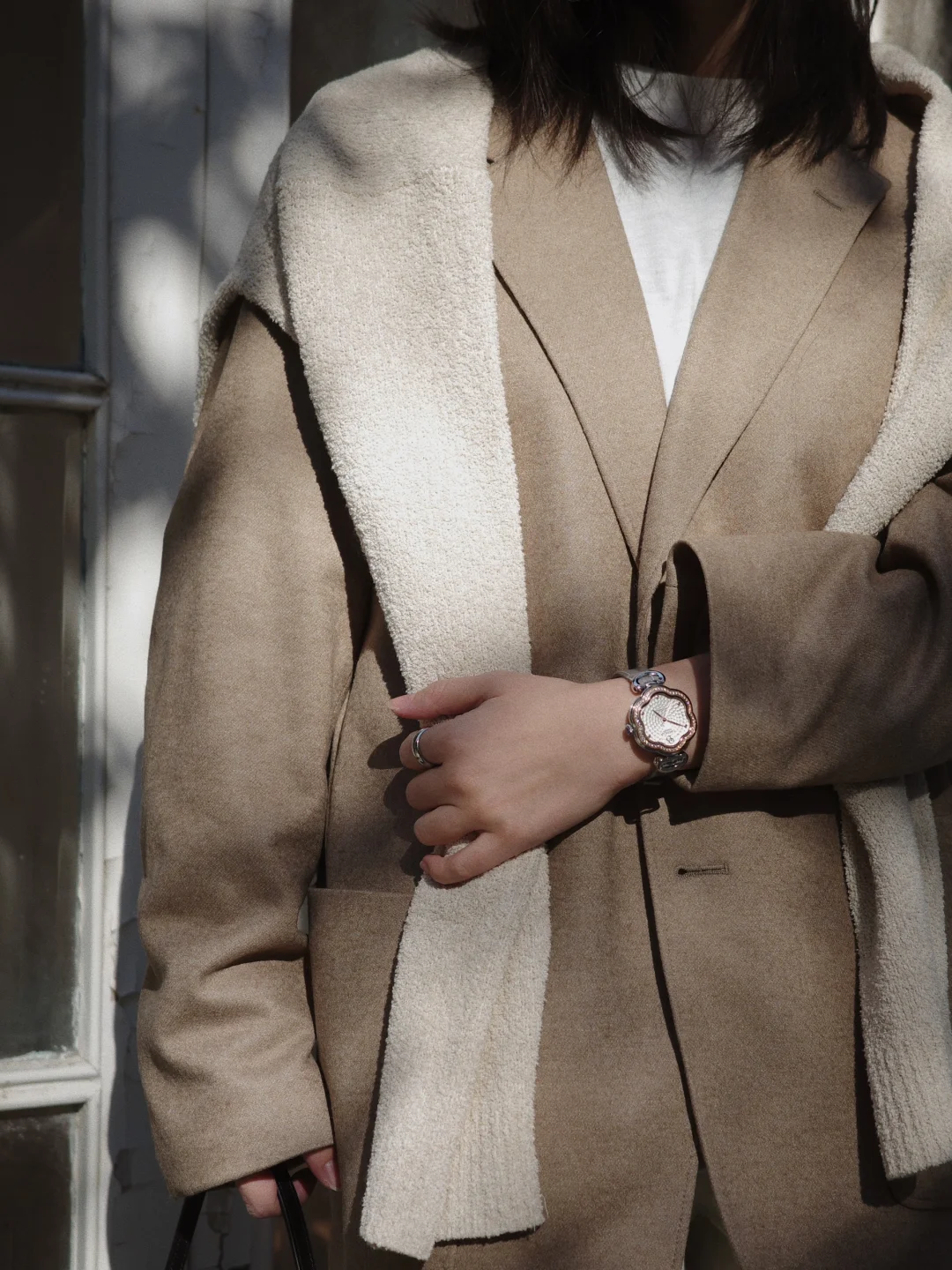 ☕️今天是一个“长期主义”OOTD, 不会过时的“驼色+米色”组合, 简单利落的剪裁, 和衣柜大多数单品好像都能搭配上。 ⌚️腕表也是长期主义绕不开的单品, 鳄鱼皮表带永远是首选, 自带质感又好搭配~ 🌸ONEDEAR桃源表, 寓意喜迎财源,事业招财运🧧 是珍贵的珠宝腕表,亦是对自己的美好祝愿🫶🏻