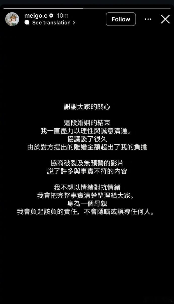 刚刚,粿粿在社交平台发文回应被范姜彦丰爆料出轨王子邱胜翊,称一直在以理性与诚意沟通,但由于对方提出的离婚金额超出负担,协商破裂。她还称范姜彦丰的视频有许多与事实不符的内容,“我会把完整事实清楚整理后告诉大家。”