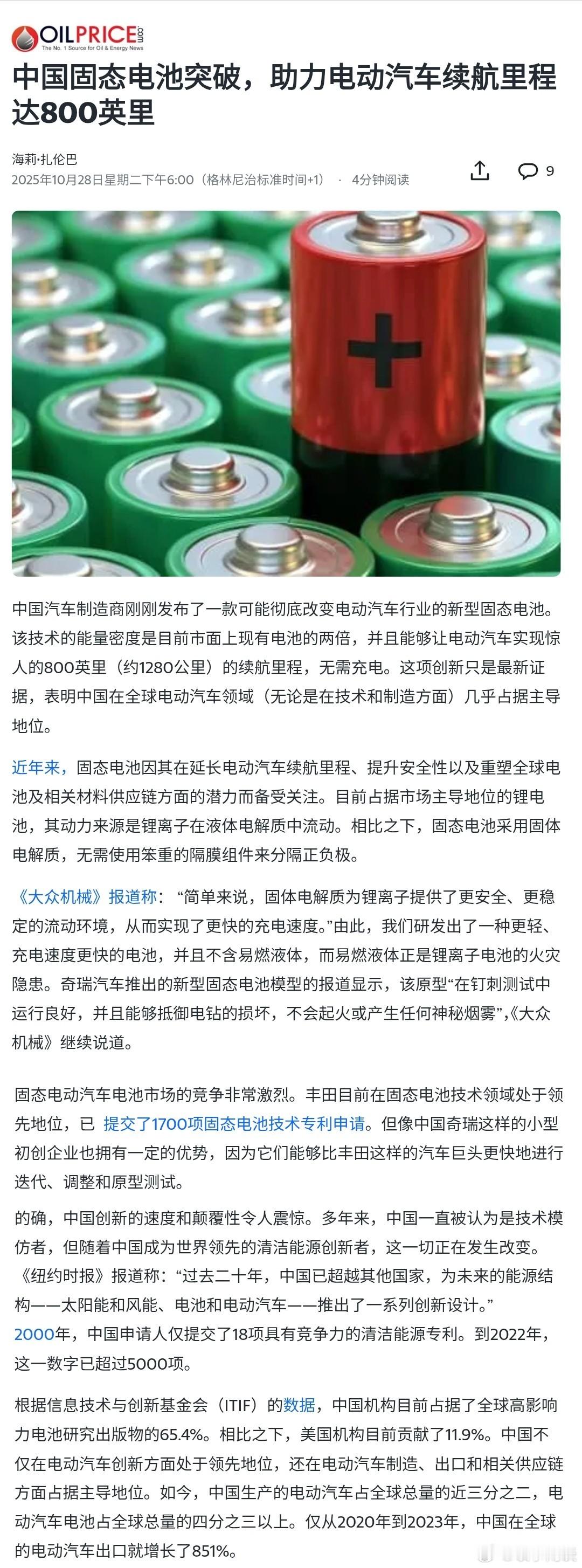 【中国固态电池突破,助力电动汽车续航里程达800英里】