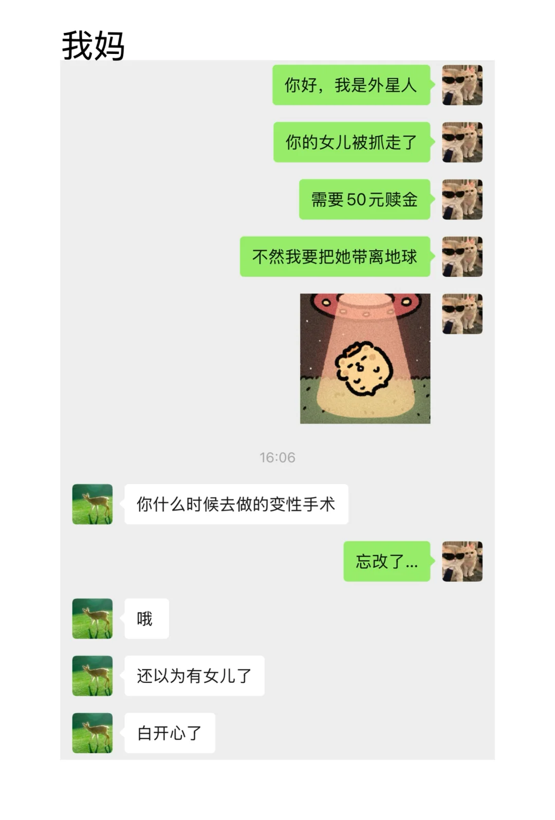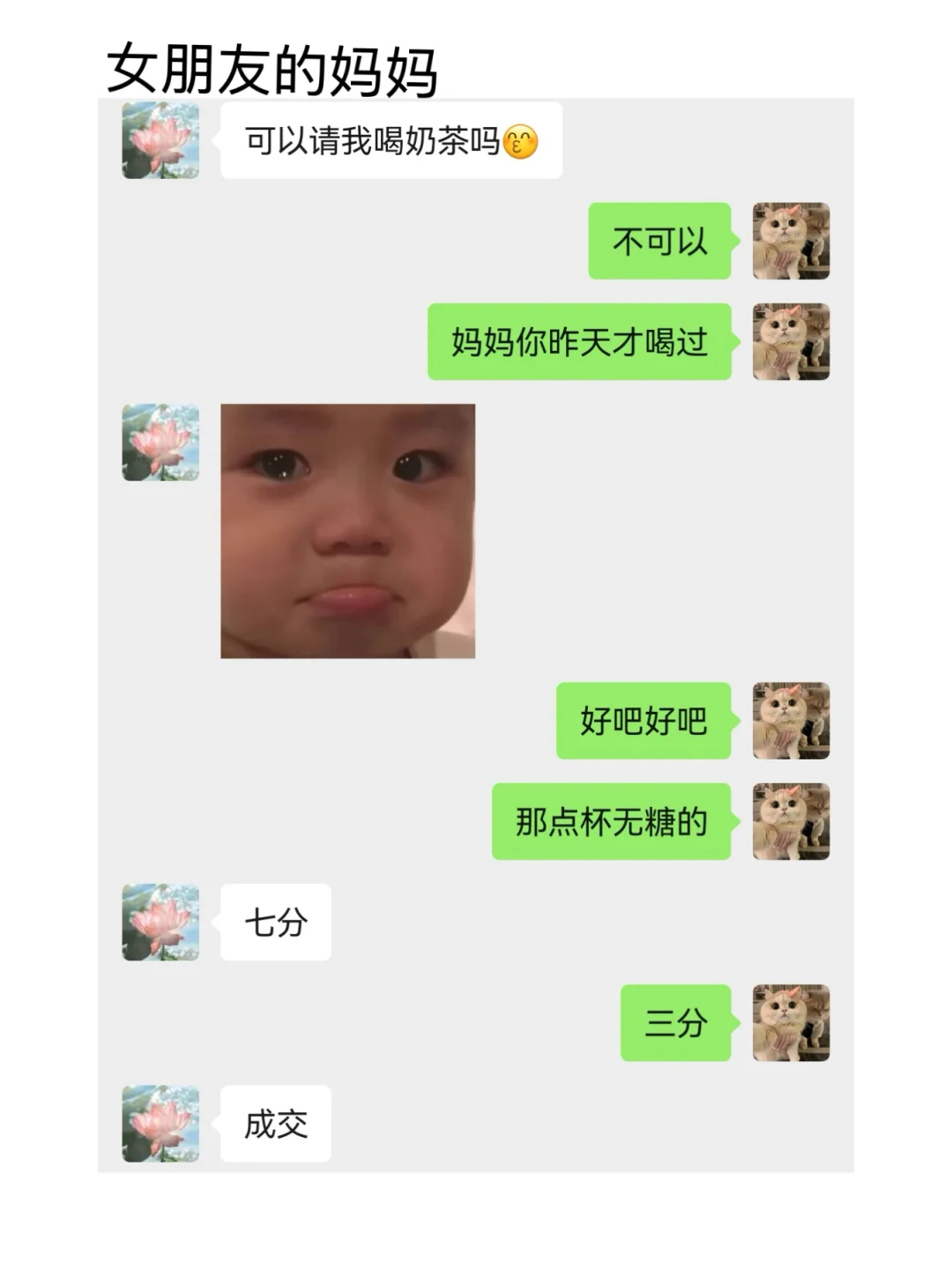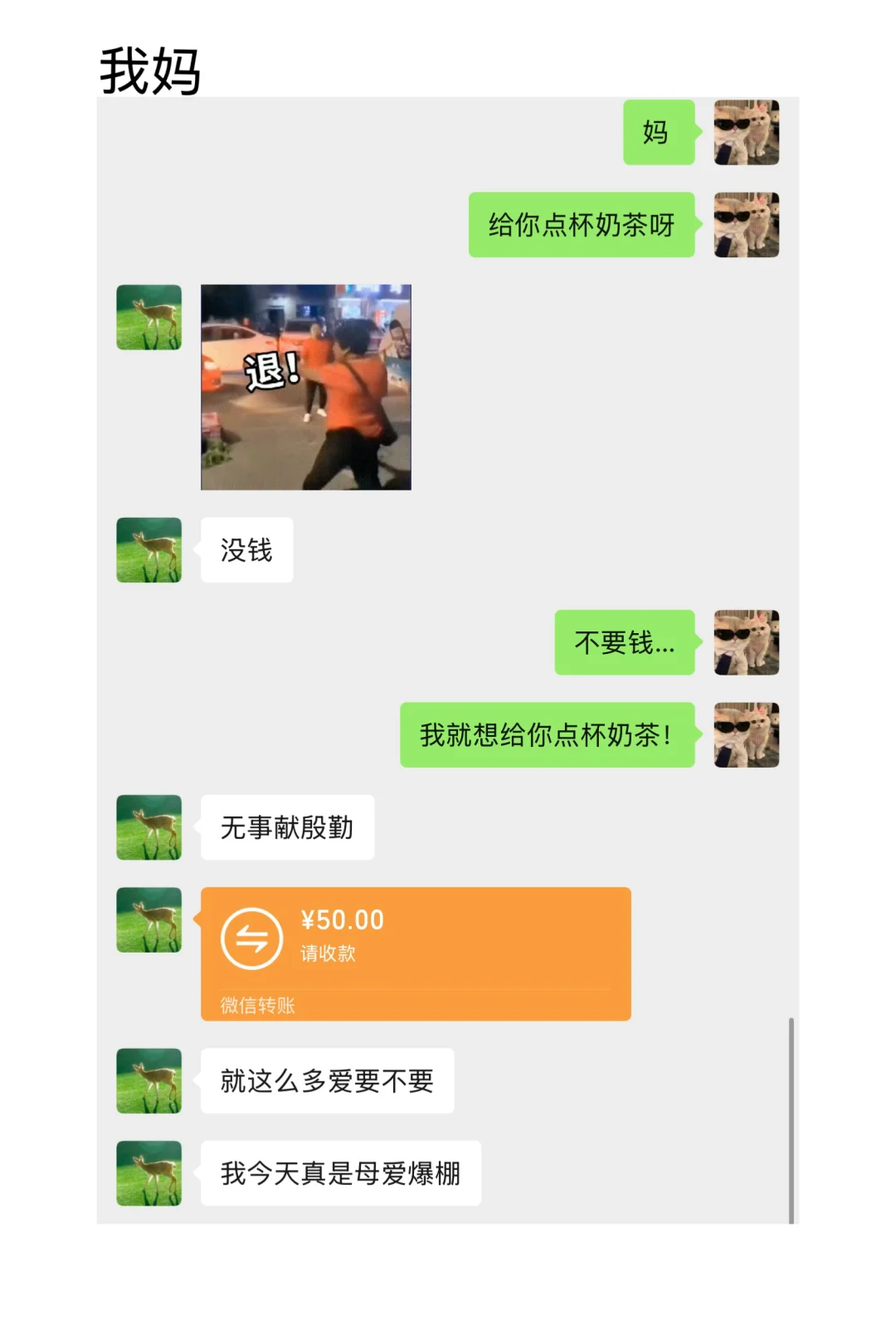 结论: (1)我妈对我的抗压能力信心十足,是了。 (1)我妈不但不喝奶茶还转我50,赚了。 (2)没人能骗到我家这二老💰,稳了。