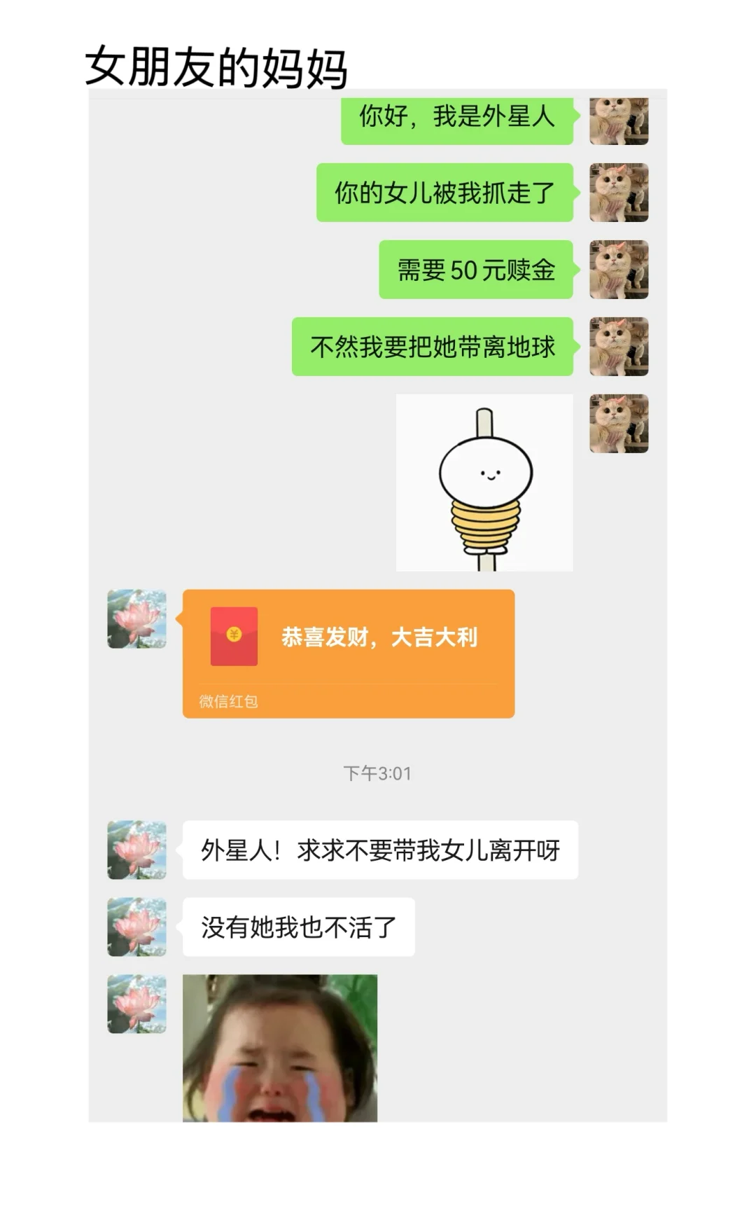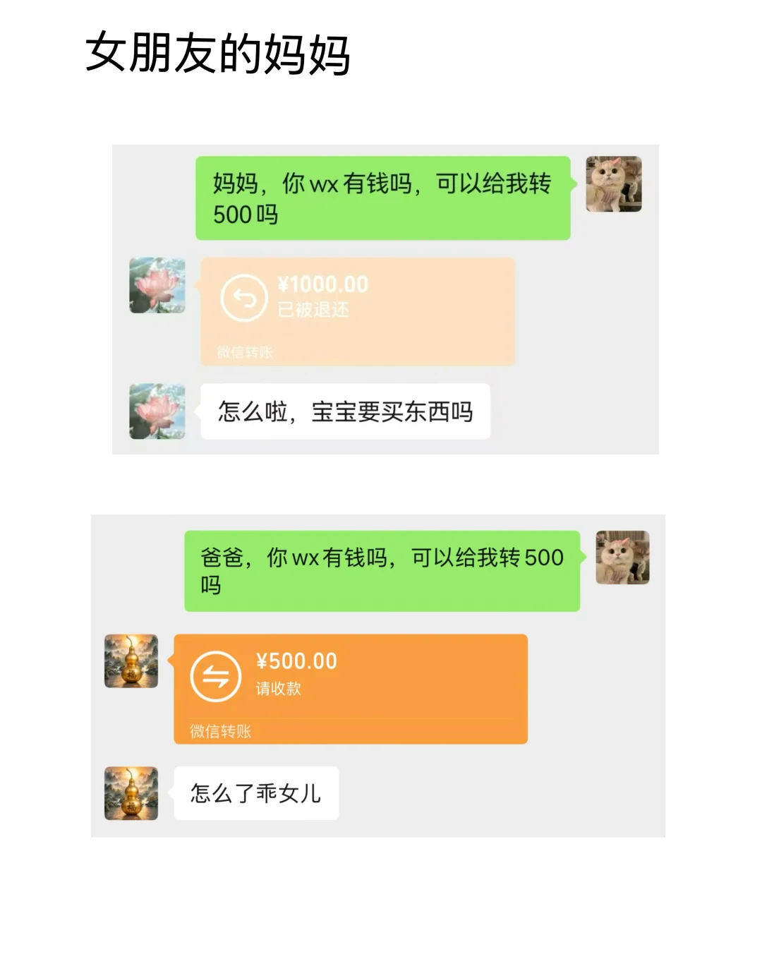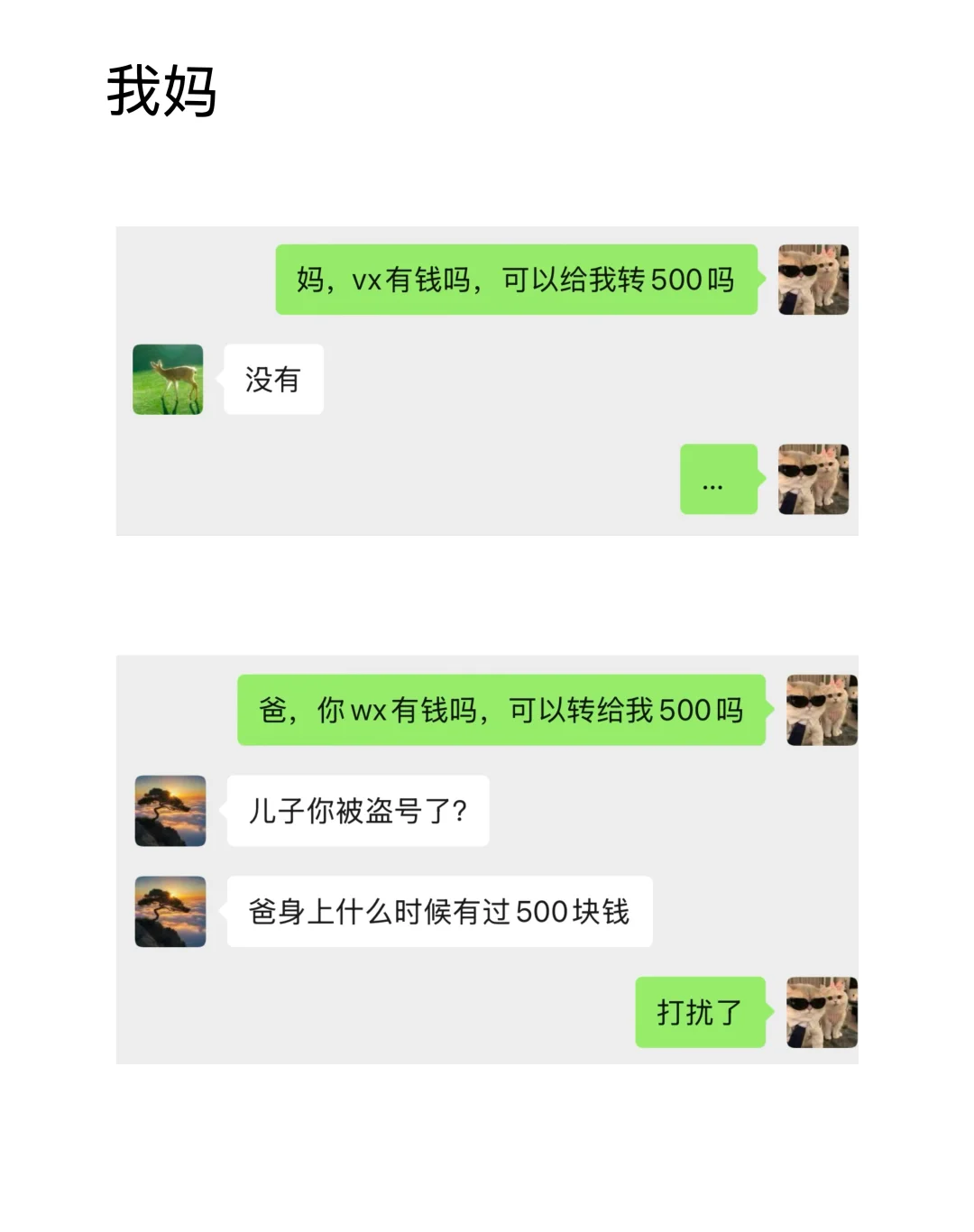 结论: (1)我妈对我的抗压能力信心十足,是了。 (1)我妈不但不喝奶茶还转我50,赚了。 (2)没人能骗到我家这二老💰,稳了。