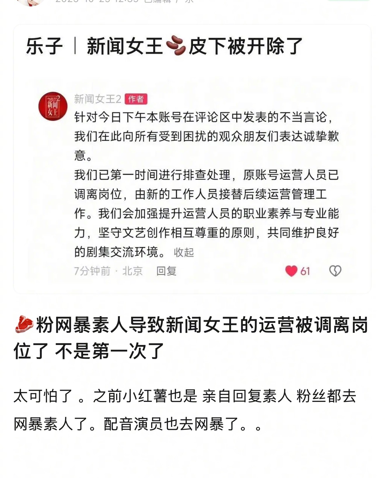 新闻女王皮下小编被处罚之后,网友说赵露思粉丝网暴素人,这事是粉丝的问题吗?新闻女