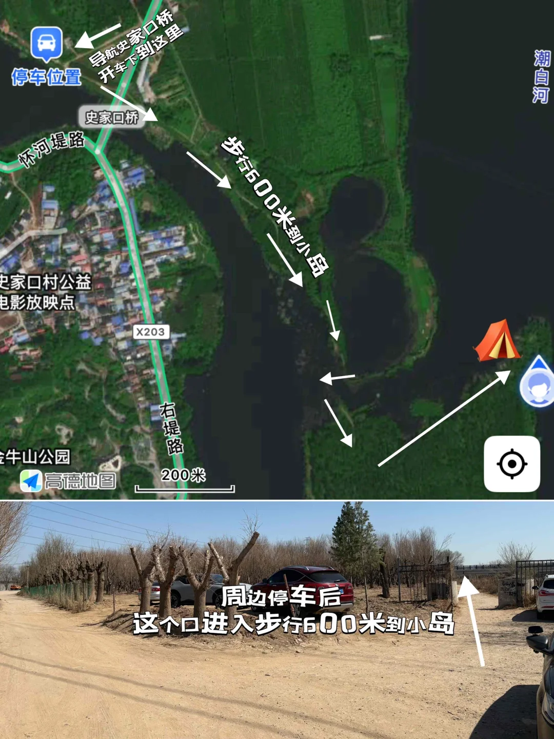 顺义潮白河与怀河交汇位置有一座小岛 市区开车不到1h即到停车步行800米上岛 有一座土桥与陆地连接河水清澈环境很棒 ⛺️小岛边上很平坦可以露营野餐 🏖️河边都是细沙孩子可以玩沙子 🦐水里鱼虾很多钓鱼捕虾很有乐趣 📍导航史家口桥(详见图14)