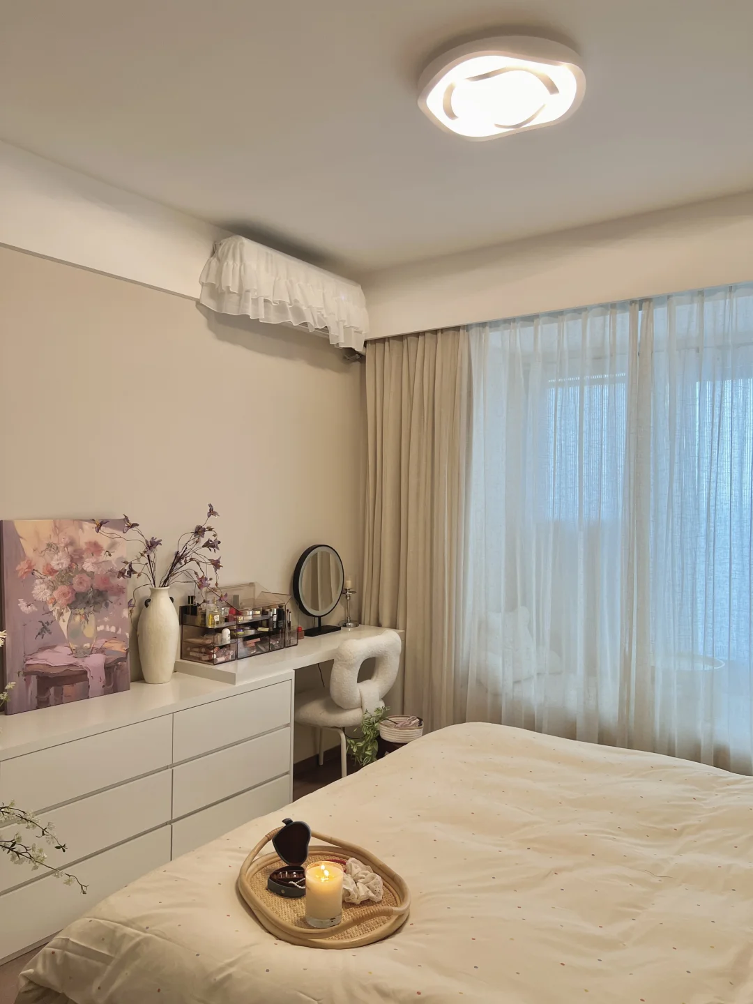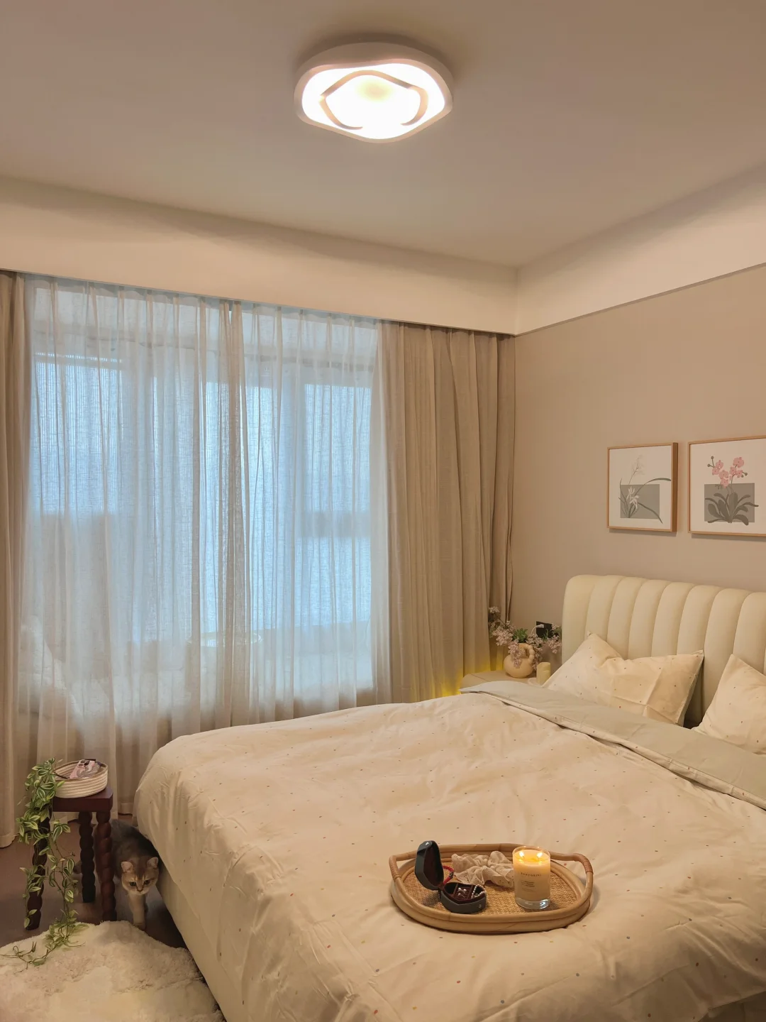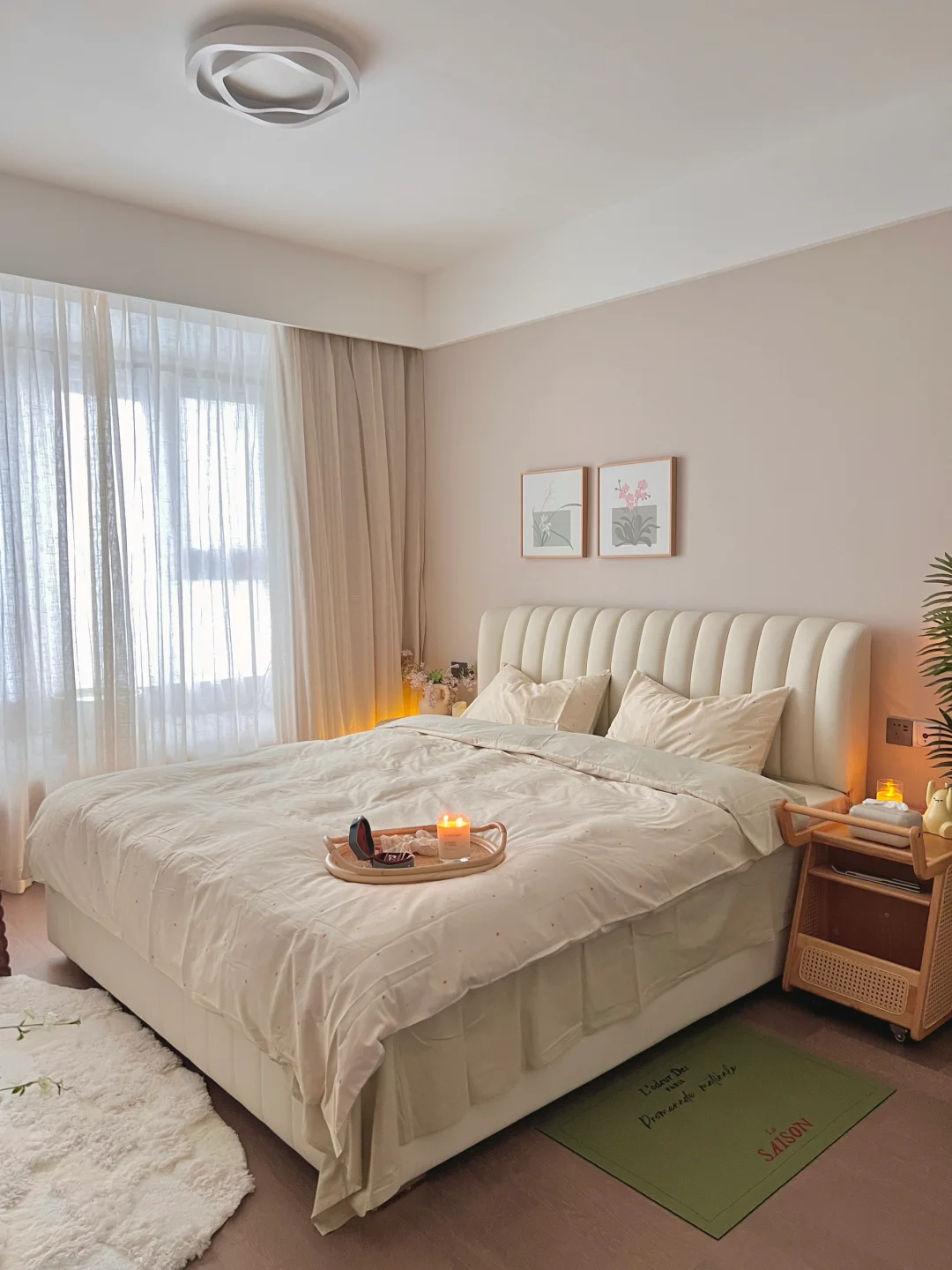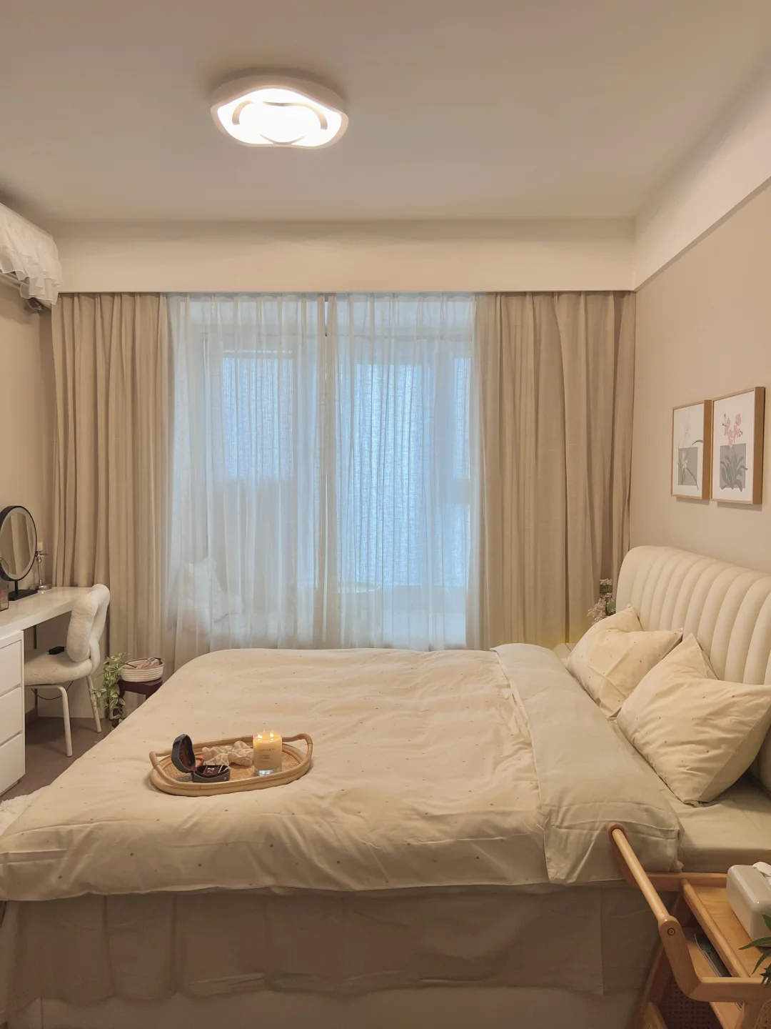 我家主卧是3.3✖️3.95m的精装房,带了飘窗和卫生间🏠,由于资金有限,没有做太多改造,简简单单也能打造奶油中古风~ · 没有吊顶,没做柜子,全屋通铺墙布加上精装自带木地板和窗帘盒,也可以很好看✨ 波点四件套少女心满满,搭配奶油花边吸顶灯,点上喜欢的香薰🕯️ 融合了无花果和醋栗的味道,丰富而温暖🥰整个房间都变温柔了💕 · 日子虽平淡,但很幸福❤️ 这就是结婚有家的意义吧