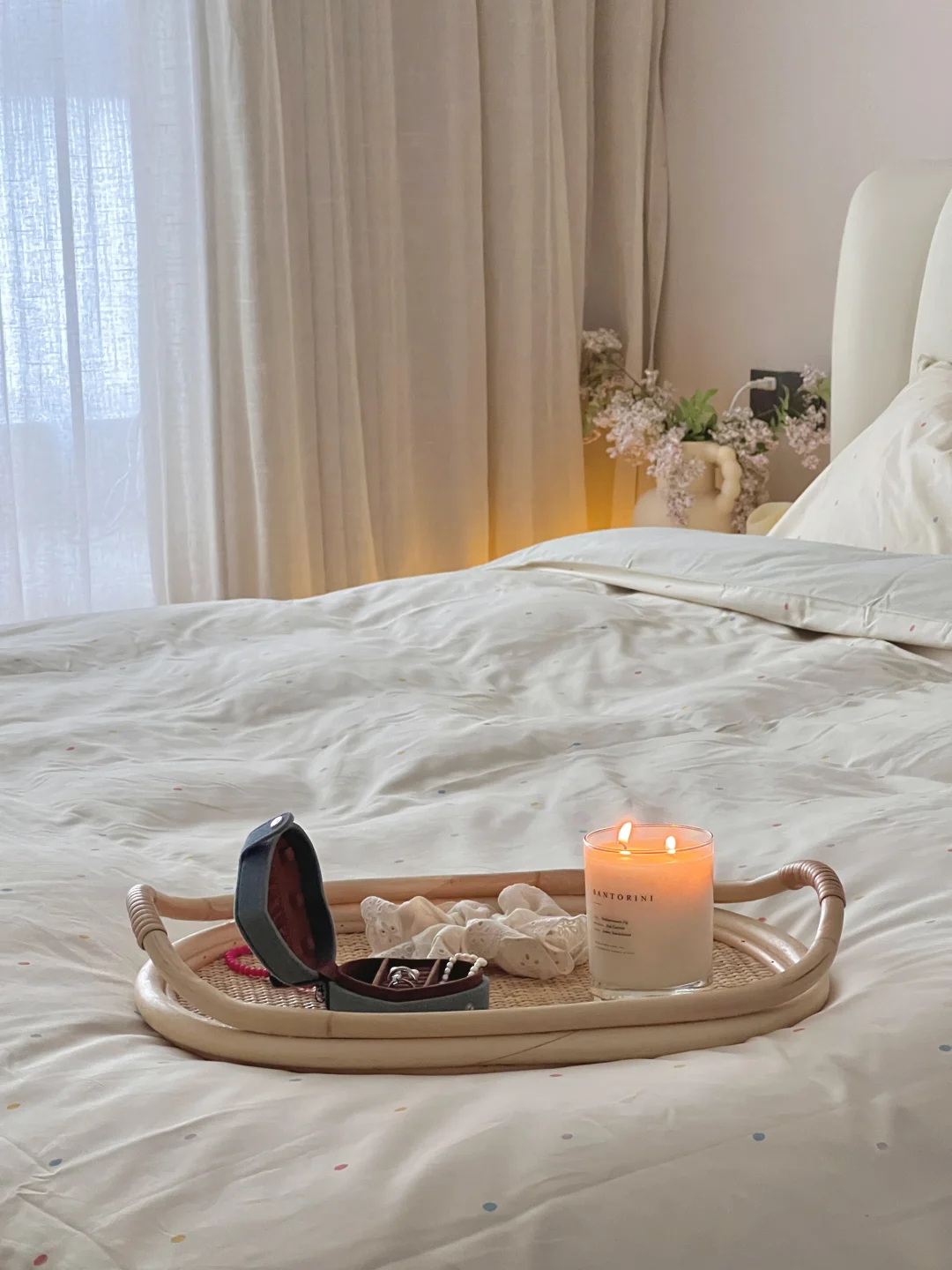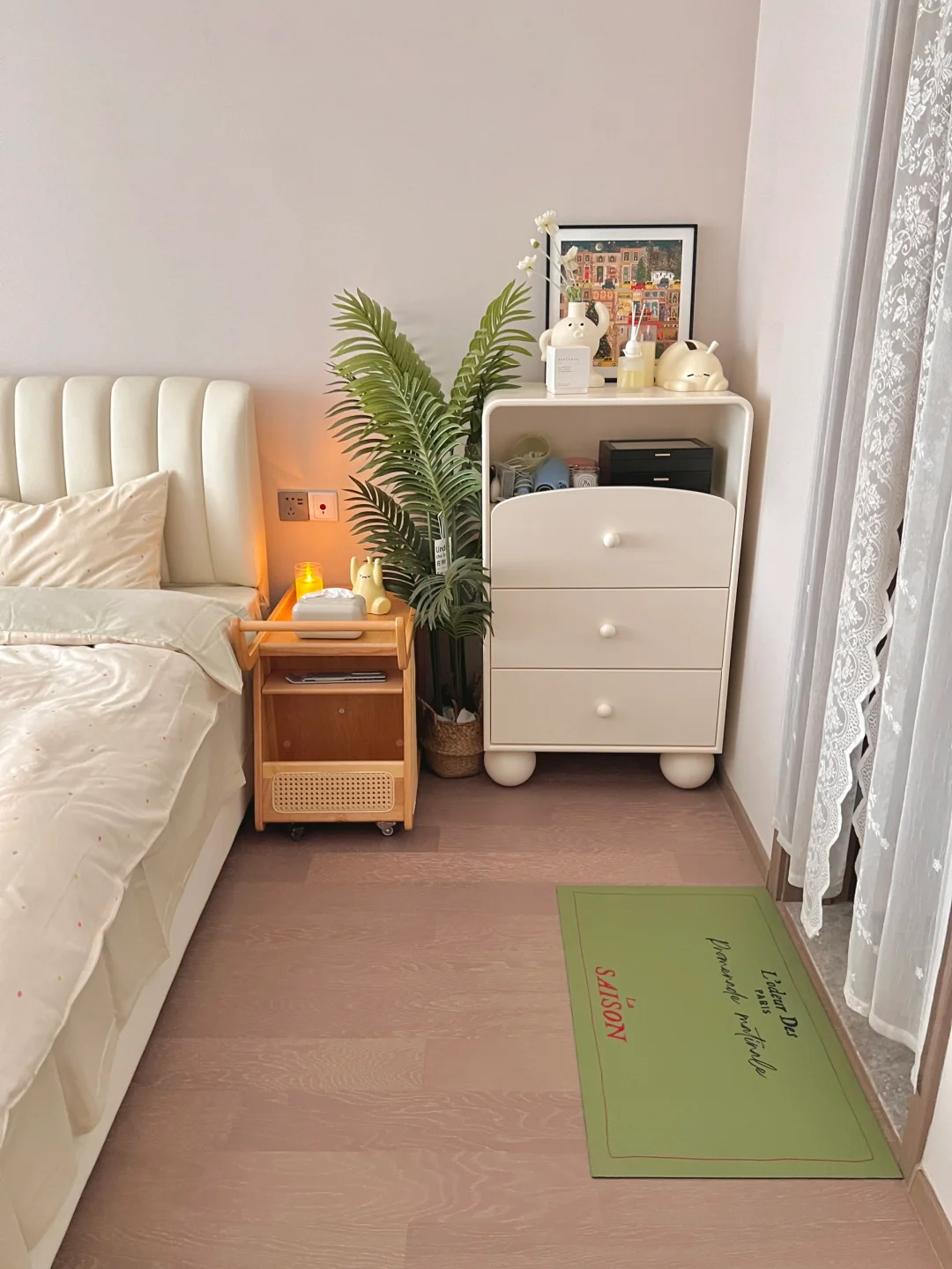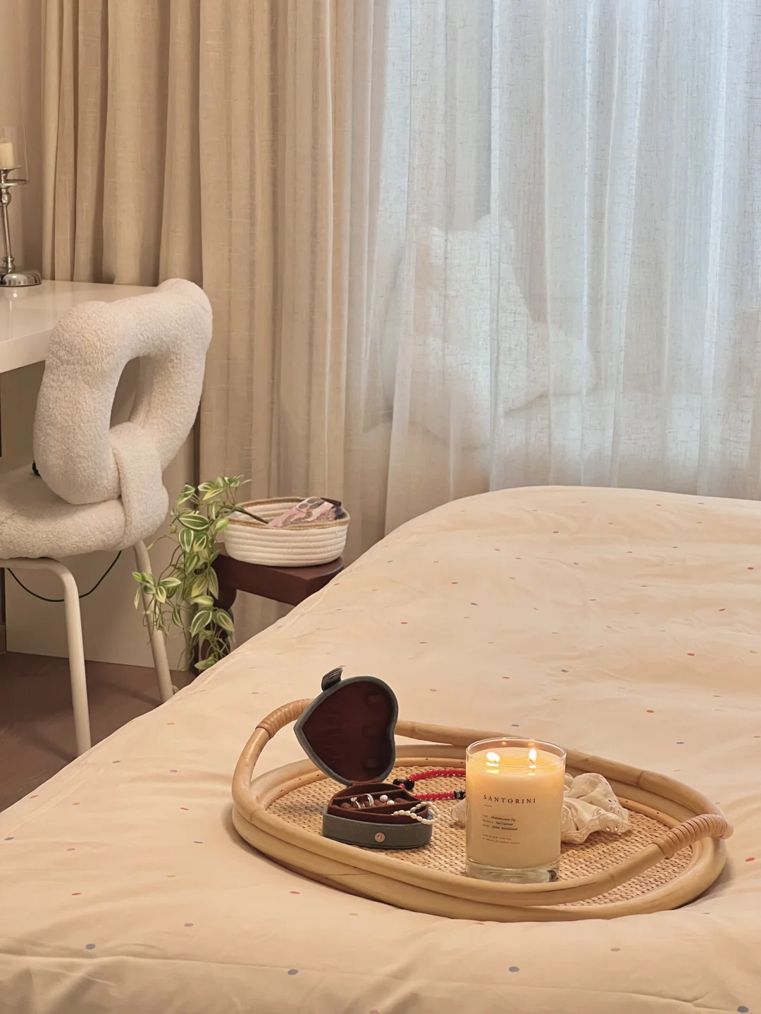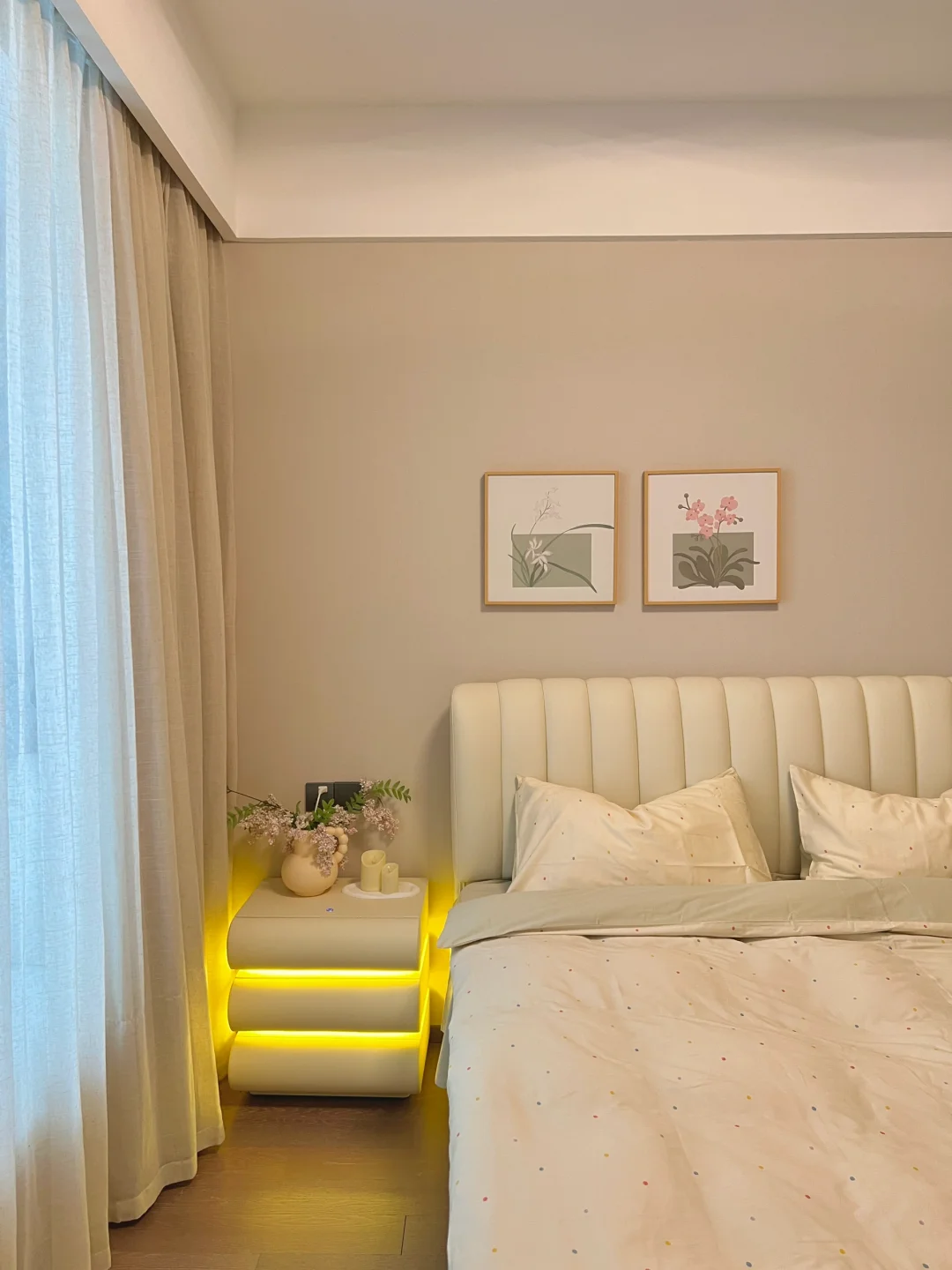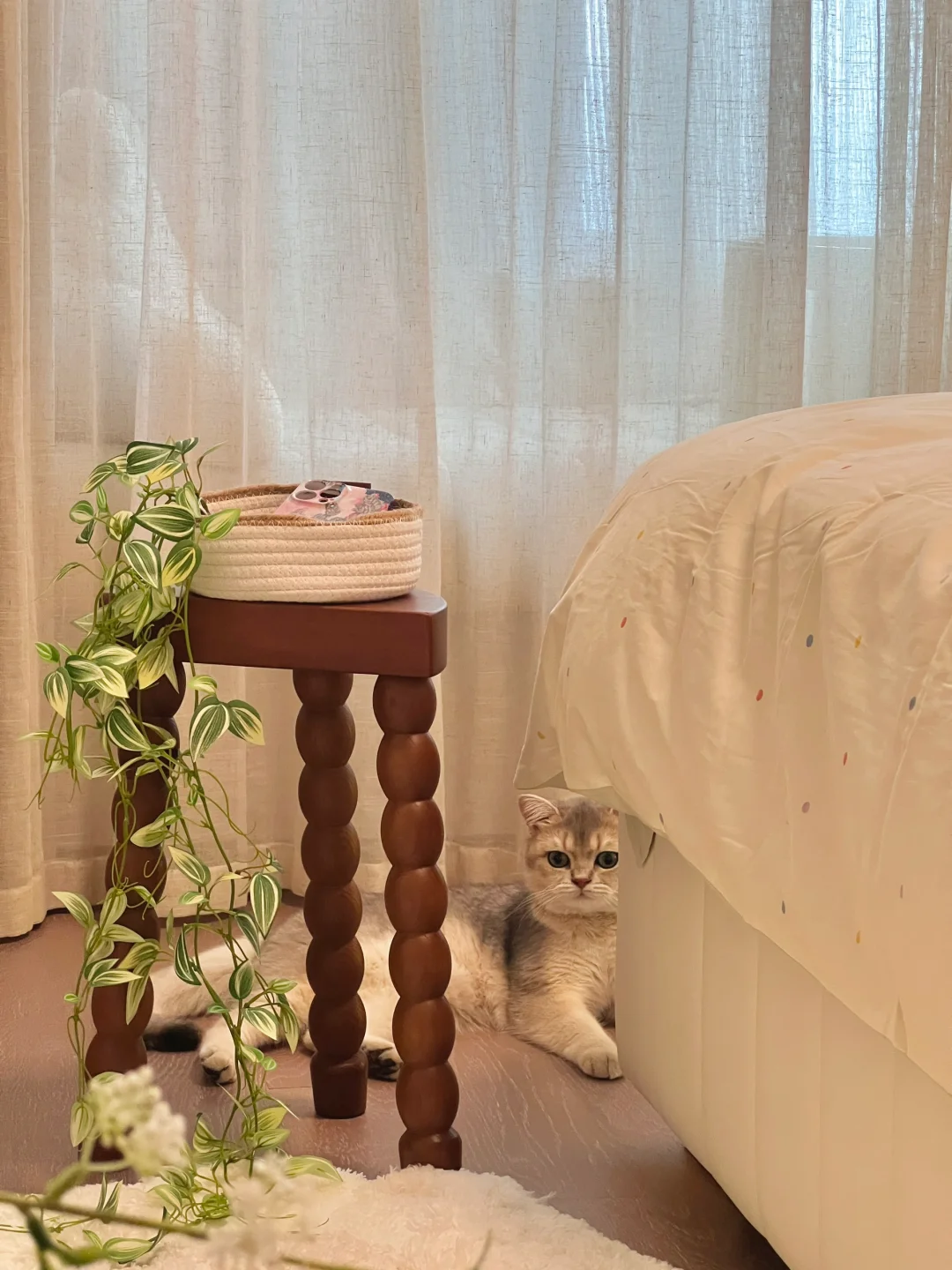 我家主卧是3.3✖️3.95m的精装房,带了飘窗和卫生间🏠,由于资金有限,没有做太多改造,简简单单也能打造奶油中古风~ · 没有吊顶,没做柜子,全屋通铺墙布加上精装自带木地板和窗帘盒,也可以很好看✨ 波点四件套少女心满满,搭配奶油花边吸顶灯,点上喜欢的香薰🕯️ 融合了无花果和醋栗的味道,丰富而温暖🥰整个房间都变温柔了💕 · 日子虽平淡,但很幸福❤️ 这就是结婚有家的意义吧