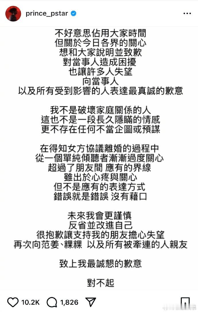 王子致歉王子 我不是破坏家庭关系的人 刚刚,王子邱胜翊在社交平台发文回应插足范姜彦丰、粿粿,“我不是破坏家庭关系的人,这也不是一段长久隐瞒的情感”,并表示在得知女方协议离婚的过程中,从一个单纯倾听者渐渐过度关心,超过了朋友间应有的界线,“虽出于心疼与关心,但不是应有的表达方式,错误就是错误没有借口,未来我会更谨慎。”