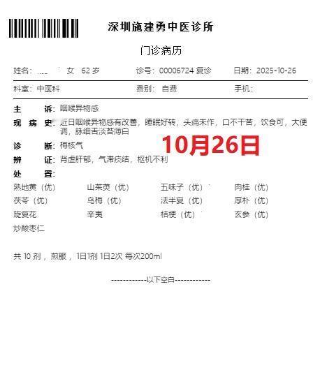 家住深圳福田的患者,咽喉有异物感很多年了,在医院确诊为咽喉滤泡增生,平时感觉喉中痰滞,睡眠不实,浮浅易醒,易疲劳,同时还有口干口苦,经常头痛。患者10月15号过来看诊,服药十天后,10月26号复诊时反馈:咽喉异物感改善,睡眠好转,口不干苦,服药后头也没痛过了。
