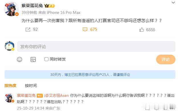 法老前女友喊话Asen紫菜蛋花兔发文喊话Asen 法老前女友“紫菜蛋花兔”喊话Asen:“为什么要再一次伤害我?跟所有造谣的人打赢官司还不够吗还想怎么样?? ”“你为什么要说这样的话啊为什么啊你告诉我啊??????谁出轨啊??????谁在出轨??????”