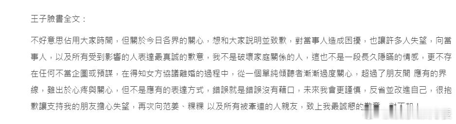 王子致歉 王子邱胜翊在社交平台发文回应插足范姜彦丰、粿粿,“我不是破坏家庭关系的人,这也不是一段长久隐瞒的情感”,并表示在得知女方协议离婚的过程中,从一个单纯倾听者渐渐过度关心,超过了朋友间应有的界线,“虽出于心疼与关心,但不是应有的表达方式,错误就是错误没有借口,未来我会更谨慎。”