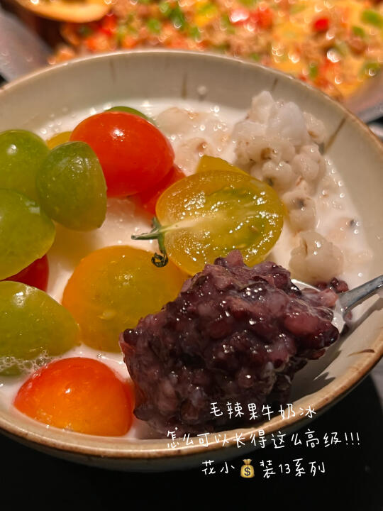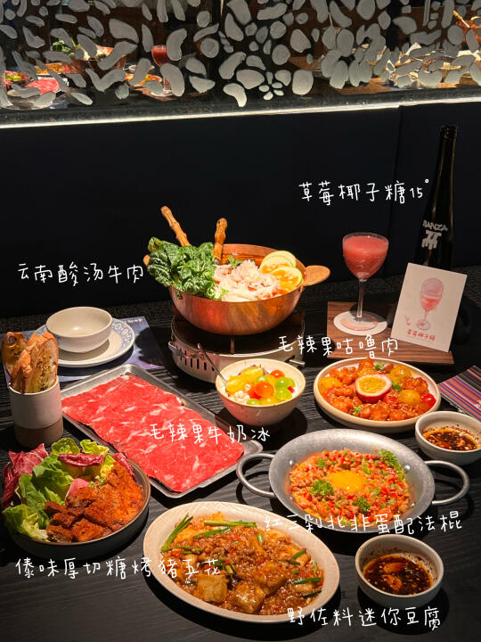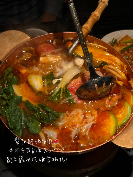 朋友们纷纷三刷的餐厅 而我竟然现在才吃上😅 喜欢毛辣果牛奶冰 清爽但不寡淡 🫒 𝗍𝗈𝗉𝗉𝗂𝗇𝗀的黑糯米让口感更丰富了 被馋了很久的贵州酸汤牛肉吃上啦~ 蘸水真的很可!