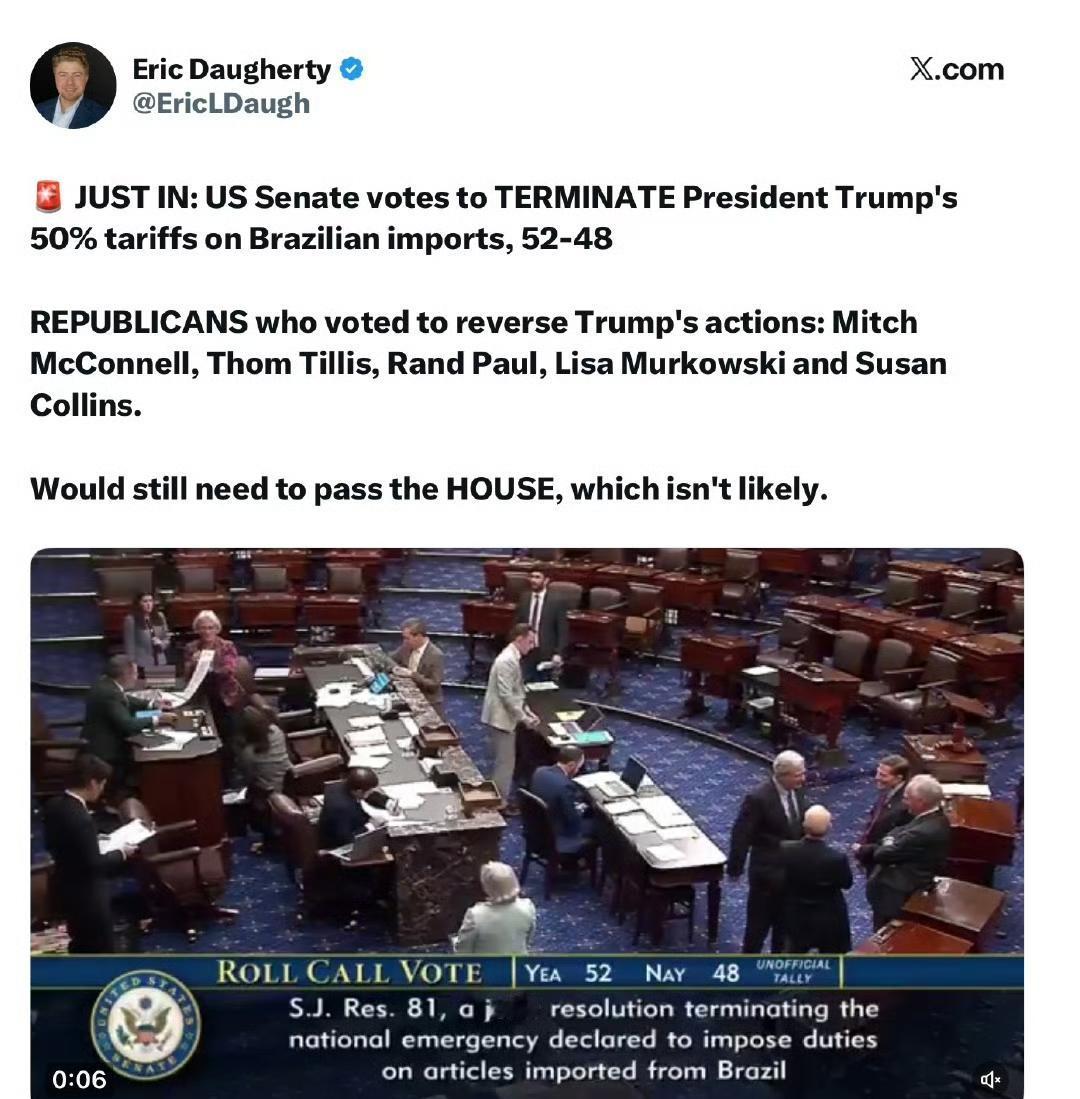 美国参议院以52票赞成、48票反对的投票结果,终止特朗普总统对巴西进口商品征收50%关税的措施。 投下赞成票的共和党议员包括:米奇·麦康奈尔、汤姆·蒂利斯、兰德·保罗、丽莎·穆尔科斯基和苏珊·柯林斯。 该法案仍需众议院通过,但可能性不大。