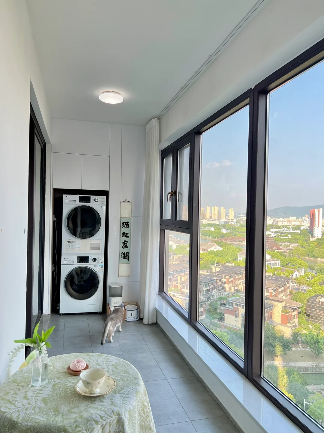 阳台左边预留出洗烘套装的空间,在其上方做了收纳柜,可以放置洗衣液之类的